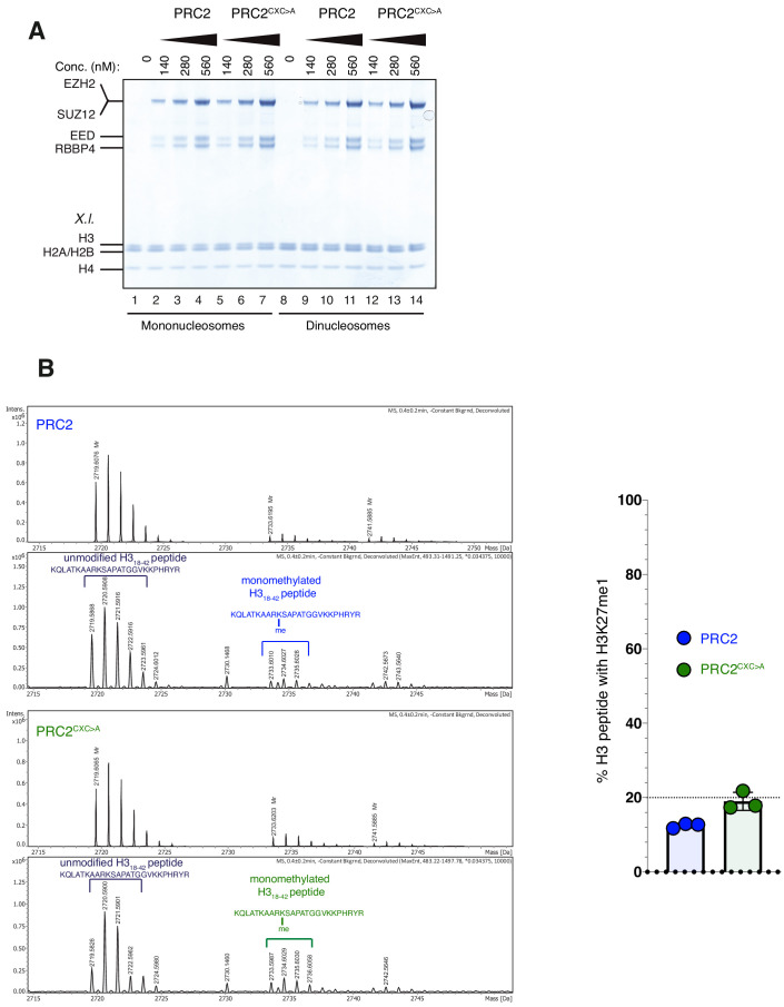 Figure 2—figure supplement 1. The EZH2CXC-DNA interaction interface is critical for H3K27 methylation on nucleosomes (related to Figure 2).(A) Coomassie-stained 4–12% SDS-PAGE of the HMTase reactions shown in Figure 2C. Xenopus laevis (X.l.) nucleosomes were used for these experiments. The short 5 kDa PHFC fragment is not visible on this gel. (B) Left: Mass spectrometry-based HMTase assays monitoring H3K27me1 formation by PRC2 (blue; upper two panels) and PRC2CXC>A (green; lower two panels) on H318-42 peptides. Representative full ESI MS Spectra (top part) and deconvoluted spectra (lower part) are shown for the individual runs. For both runs, peaks indicated by the brackets were used for quantification of H3K27me1 formation. Right: Symbols represent percentages of peptides carrying H3K27me1 in technical triplicate experiments; error bars show SD. |