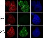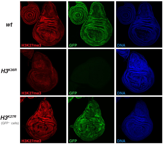 Figure 6—figure supplement 1 H3K27me3 levels are uniformly reduced in imaginal disc tissues from H3K36R mutant larvae (related to Figure 6). Imaginal wing discs from wildtype (wt) or H3K36R mutant third instar larvae and, as reference, from a larva with clones of H3K27R mutant cells that are marked by the absence of GFP. In all cases discs were stained with antibody against H3K27me3 (red), and with Hoechst (DNA) to label all nuclei. The discs from wt larvae, marked by GFP in all nuclei, and H3K36R mutant larvae, marked by the absence of GFP signal, come from preparations where larvae of the two genotypes were formaldehyde-fixed and antibody-labeled in the same vial, mounted on the same slide and photographed by confocal microscopy with identical exposure settings. Note that the H3K27me3 immunofluorescence signal appears uniformly reduced across the tissue. These are a single confocal section across a disc and not all nuclei are in exactly the same focal plane, accounting for some differences in signal intensity across the images. The wing disc with clones of H3K27R mutant cells, marked by the absence of GFP, is shown as reference for the specificity of the H3K27me3 antibody signal. |
