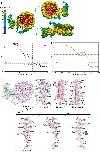 Figure 1—figure supplement 1. Initial Cryo-EM analysis of the PHF1-PRC2:di-Nuc complex (related to Figure 1).(A) Representative micrograph of the cryo-EM dataset (left) and reference-free 2D classes from particles picked without templates (right) (performed to ensure that no bias was introduced through templates picking and references in 3D classification). Circles indicate particles, which were picked with templates and directly subjected to 3D analysis (see Figure 1—figure supplement 2). (B) Local resolution estimation of the 5.2 Å overall PHF1-PRC2:di-Nuc map. The substrate nucleosome and the adjacent part of EZH2 are well resolved (colors red to yellow). (C) Spherical angular distribution of particles included in the final reconstruction of PHF1-PRC2:di-Nuc. (D) Output from the 3DFSC Processing Server (https://3dfsc.salk.edu/ Tan et al., 2017) showing the Fourier Shell Correlation (FSC) as a function of spatial frequency, generated from masked independent half maps of PRC2:diNuc: global FSC (red), directional FSC (blue histogram) and deviation from mean (spread, green dotted line). The nominal overall resolution of 5.24 Å was estimated according to the gold standard FSC cutoff of 0.143 (gray dotted line) (Rosenthal and Henderson, 2003). Sphericity is an indication for anisotropy and amounts to 0.806 in this data. The minor directional anisotropy of the data can be explained by the slightly preferred orientation and missing views as seen in (C). (E) Top: Refined and postprocessed cryo-EM density map of overall PHF1-PRC2:di-Nuc colored according to the subunit organization. Bottom: pseudoatomic model of fitted crystal structure of the human PRC2 catalytic lobe (PDB: 5HYN; Justin et al., 2016) and a di-Nuc model with 35 bp linker DNA (Poepsel et al., 2018), including PDB 1AOI (Luger et al., 1997). |