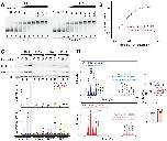 Figure 2 with 1 supplement The EZH2CXC-DNA interaction interface is critical for H3K27 methylation on nucleosomes. (A) Binding reactions with indicated concentrations of PRC2 (lanes 1–10), PRC2CXC>A (lanes 11–20), PRC2CXC>A/EED>A (lanes 21–30), or PRC2EED>A (lanes 31–40) and 45 nM 6-carboxyfluorescein-labeled mononucleosomes, analyzed by EMSA on 1.2% agarose gels. The EMSA with PRC2EED>A was run on a separate gel. (B) Quantitative analysis of EMSA data in A by densitometry of 6-carboxyfluorescein signals from independent experiments (n = 3); error bars, SEM. (C) Western Blot (WB) analysis of H3K27me1 and H3K27me3 formation in HMTase reactions with indicated concentrations of PRC2 and PRC2CXC>A on 446 nM mononucleosomes (lanes 1–7) or 223 nM dinucleosomes (lanes 8–14). Note that these concentrations result in equal numbers of nucleosomes and therefore equal numbers of H3 substrate molecules in the reactions on mono- and dinucleosomes, as can be seen from the Coomassie-stained gel of the reactions in Figure 2—figure supplement 1B. H4 WB signal served as control for western blot processing. |