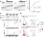 Figure 3 with 1 supplement The unmodified H3K36 side chain in the EZH2CXC-DNA interaction interface is critical for H3K27 methylation on nucleosomes. (A, B) EMSA analysis and quantification as in Figure 2A and B, using PRC2 and mononucleosomes that were unmodified (lanes 1–10) or contained a trimethyllysine analog at H3K36 (H3Kc36me3, lanes 11–20) (Simon et al., 2007). (C) Western blot (WB) analysis of HMTase reactions with PRC2 as in Figure 2C on unmodified (lanes 1–4), H3Kc36me3 (lanes 5–7), H3K36R (lanes 8–10) or H3K36A (lanes 11–13) mononucleosomes (446 nM). Coomassie-stained gel of reactions is shown in Figure 3—figure supplement 1A. Bottom: quantification of H3K27me3 and H3K27me1 chemiluminescence signals, respectively, by densiometry analysis from three independent experiments. In each experiment, the methylation signal in lane four was defined as 100% and used to quantify the corresponding H3K27 methylation signals in the other lanes on the same membrane. Circles show individual data points and error bars SEM. (D) HMTase reactions monitoring H3K27me1 formation by PRC2 on H318-42 peptides that were unmodified (top) or contained K36me3 (bottom). Left: Deconvoluted ESI-MS spectra from data shown in Figure 3—figure supplement 1B. On both substrates, areas of the four colored peaks of H3K27me1-modified and unmodified substrate peptides were used for quantification of H3K27me1 formation. Right: Symbols represent percentages of peptides carrying H3K27me1 in technical triplicate experiments, error bars show SD; Welch’s t-test showed no significant (ns) difference between H3K27 monomethylation on the two peptide substrates. |