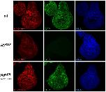 Figure 6 with 1 supplement Drosophila with H3K36R or H3K36A chromatin show defective Polycomb repression at HOX genes. (A) Ventral views of stage 16 wildtype (wt), H3K36A, H3K36R, H3K27R, or esc (esc–) mutant embryos, stained with antibody against Abd-B protein; the esc mutant embryo lacked both maternal and zygotic expression of esc (see Materials and Methods for details of all genotypes). The vertical bar marks the anterior boundary of Abd-B expression in parasegment (ps) 10 in wt embryos. Note the stochastic misexpression of Abd-B protein in single cells or pairs of cells anterior to ps10 in H3K36R and H3K36A mutant embryos (arrowheads). H3K27R and esc mutant embryos show widespread misexpression of Abd-B protein in the head-to-tail pattern characteristic of PcG mutants. For reasons that are not well understood, H3K36A and H3K36R mutants also show partial loss of Abd-B expression in cells in ps10 (empty arrowheads). (B) Larval CNS and brain lobe tissues from wildtype (wt) or H3K36R mutant third instar larvae, stained with antibody against Ubx protein (red) and Hoechst (DNA) to label all nuclei; location of CNS and brain lobes (BL) are indicated in the right panel. The white bars mark the anterior boundary of Ubx expression in ps5 in wt embryos, the asterisk marks the Ubx-expressing cells in the central midline of ps4 that are part of the wild-type Ubx pattern. Note the stochastic misexpression of Ubx protein in many single cells anterior to ps5 in the CNS and in the brain lobes (arrowheads). (C) Imaginal wing (W), haltere (H) and 3rd leg (3L) discs from wildtype (wt) or H3K36R mutant third instar larvae and, as reference, discs from a larvae with clones of H3K27R mutant cells that are marked by the absence of GFP. In all cases, discs were stained with antibody against Ubx protein (red) and Hoechst (DNA) to label all nuclei. In wt animals, Ubx is expressed in the haltere and 3rd leg disc but not in the wing disc where it is repressed by the PcG machinery. Note that in H3K36R mutants, Ubx is misexpressed in small clusters of cells in the wing blade primordium of the wing disc (arrowheads) but remains repressed in the rest of the wing disc. Such misexpression was detected in 50% of wing discs (n = 28). As reference, a wing discs with H3K27R mutant clones is shown, where all cells in the clones in the wing blade primordium (arrowheads) show misexpression of Ubx whereas cells in the notum and hinge primordium show no misexpression (empty arrowheads) (cf. Pengelly et al., 2013). Also note that in H3K36R mutants (n > 30 mutant animals analyzed), Ubx expression in haltere and leg discs appears unperturbed (asterisks). (D) Eye-antennal imaginal discs from wildtype (wt) or H3K36R mutant larvae and below discs from larvae with clones of H3K36A or H3K27R mutant cells that are marked by the absence of GFP. All animals were stained with antibody against Antp protein (red) and Hoechst (DNA) to label all nuclei. Antp is not expressed in the eye-antennal disc of wt animals. Note that in H3K36R mutant discs, Antp is misexpressed in large clusters of cells (arrowheads) in the antenna primordium (Ant). Note that Antp is also misexpressed in H3K36A or H3K27R mutant cell clones in the antenna primordium (arrowheads) and that in these cases misexpression also only occurs in a subset of the mutant cells and not in all clones. |