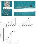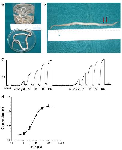 Figure 1. Contraction of Parascaris sp. muscle strips produced by acetylcholine. (a) Adult female Parascaris sp. collected from horses and used in this study; (b) photograph of a single worm indicating the location of the body muscle flap (1 cm length between the two red arrows), within the anterior part of the worm (3â4 cm caudal to the head), to be dissected for isometric contraction measurements; (c) isometric contractions of Parascaris sp. muscle flap produced by increasing concentrations of acetylcholine (ACh) from 1 to 100 µM (short bars); (d) concentrationâresponse plot for ACh fitted with non-linear regression, with mean contraction in g ± SE (n = 5).