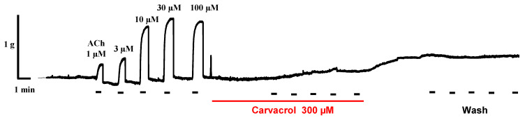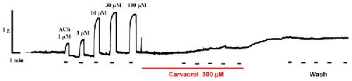 Figure 2. Effect of carvacrol on contractions of Parascaris sp. muscle strips produced by acetylcholine. Isometric contractions of Parascaris sp. muscle flap produced by increasing concentrations of acetylcholine (ACh) from 1 to 100 µM (left panel, short bars) and inhibition of contractions mediated by 300 µM carvacrol (middle panel, full line). Absence of ACh-induced response recovery after washing the preparation (right panel).