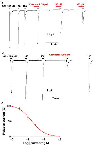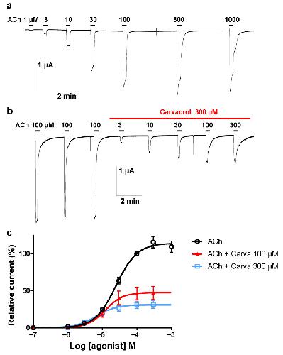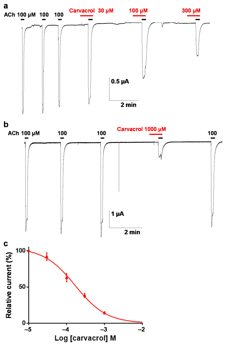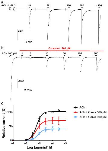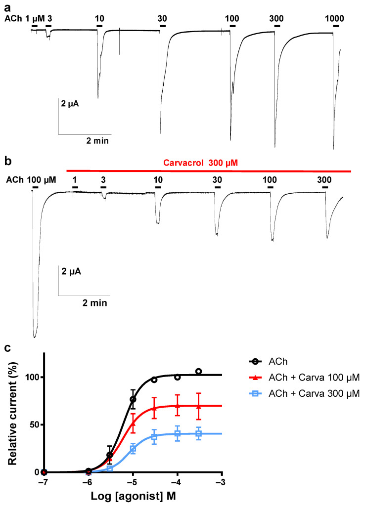 Figure 5. Carvacrol effect on the ACh concentration–response relationships for the Parascaris sp. ACR-16 N-AChR expressed in Xenopus oocytes in absence of carvacrol (a) or in presence of carvacrol (b). Representative current traces for single oocytes. The concentrations of ACh and carvacrol (µM) are indicated above each trace. Bars indicate drug applications: ACh was applied for 10 s, and carvacrol was applied for 11 min (red bar). (c) Concentration–response curves. All responses are normalized to 100 µM ACh. Results are shown as the mean ± SE (n = 6–10).