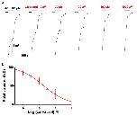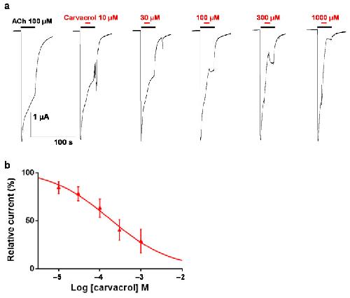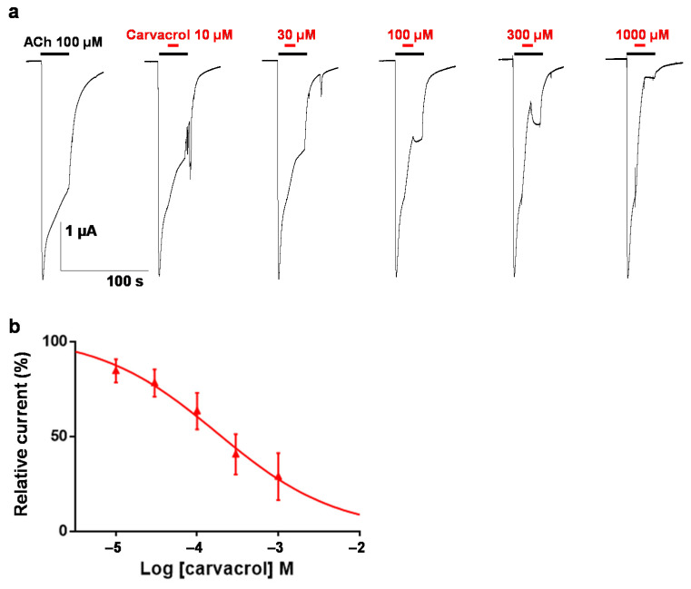 Figure 6. Concentration–inhibition relationship of carvacrol on the Parascaris sp. ACR-16 N-AChR expressed in Xenopus oocytes. (a) Representative current traces for single oocytes challenged with acetylcholine (ACh) in the presence of increasing concentration of carvacrol from 10 to 1000 µM. The concentrations of ACh and carvacrol (µM) are indicated above each trace. ACh was applied for 30 s intervals (black bars), and carvacrol was applied for 10 s (red bars). (b) Concentration–inhibition response curve of carvacrol. All responses are normalized to 100 µM ACh. Results are shown as the mean ± SE (n = 6).