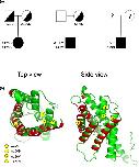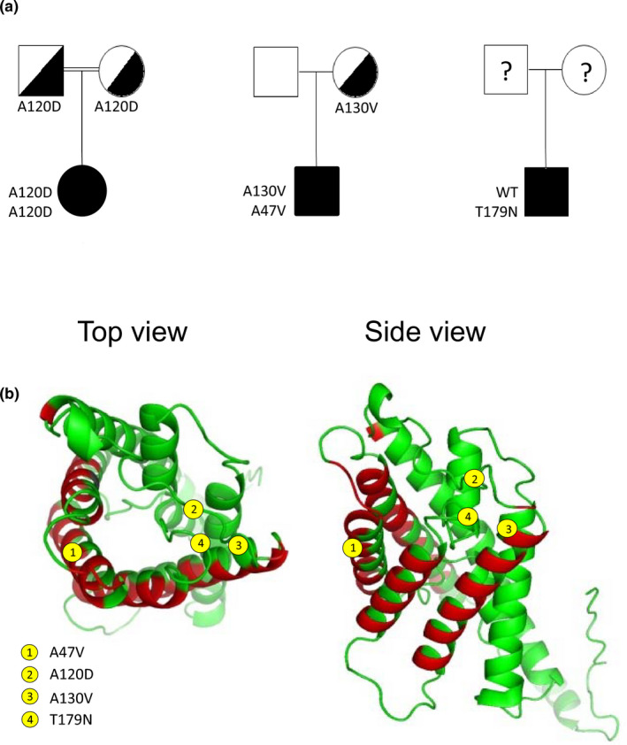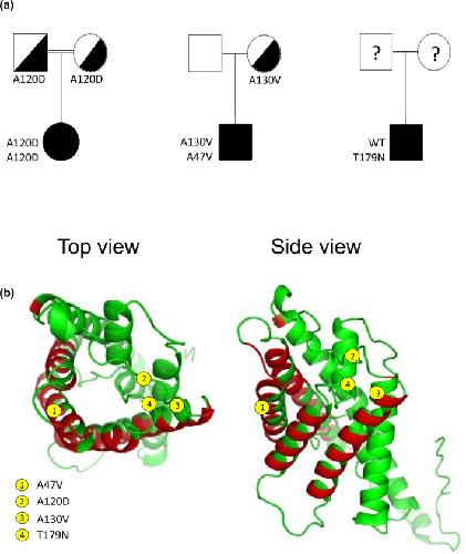 FIGURE 1. Family pedigrees and location of four mutations in study. (a) Pedigree of three families with congenital nephrogenic diabetes insipidus probands showing homozygosity for A120D, compound heterozygosity for A130V/A47V, and heterozygosity for T179N. (b) Positioning of the four mutations in study within the reported structure of AQP2 (top and side views). Sections in red represent alpha helices segments participating in interunit association.
