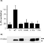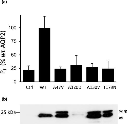 FIGURE 2. Expression of AQP2 variants in oocytes. Functionality determinations (a) along corresponding Western Blot (b) from a typical experiment (oocyte batch). Oocytes were injected with equivalent amounts of mRNAs for each AQP2 variants (0.5 ng) and incubated for 24 h prior to testing. (a) Specific Pf values are in % ± SD of wtâAQP2 with n = 6 to 8 oocytes for each variant. Activity levels of all variants were similar to Ctrl (see statistics in supporting information). (b) Typical double bands (29 kDa (*) and 31 kDa (**) labeling for nonâglycosylated and highâmannose forms, respectively, with 25 kDa MW marker indicated) are found for A47V, A130V and T179N. Note that although faint, the double bands are also found for A120D in overexposed blot.