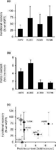FIGURE 5. Functional recovery of four rec‐AQP2 mutations. Similarly to procedure in Figures 3 and 4, oocytes were injected with 0.5 ng mRNA coding for A47V, A120D, A130V and T179N either in absence (−) or presence (+) of wt‐AQP2 (equimolar GFP‐wt‐AQP2 in Western blots) and incubated for 24 h prior testing for activity (water permeability in a) and protein content (densitometry analysis of Western blot in b). (a) Recovery evaluation for each variant calculated by subtracting specific activities form single to dual (wt + mutant) expression conditions (similar to Figure 3c). Data represent % ± SD of wt‐AQP2 with n = 3–5 assays (see supporting information for p values). (b) Fold increase in protein contents (29 + 31 kDa bands) for each mutant (+ over − values, similar to Figure 4b) with n = 3–6 assays. (a) Plot correlating increased protein stability to functional recovery using data from panel (a) and (b), to which are added values for wt‐AQP2 (□) and R187C (∆).