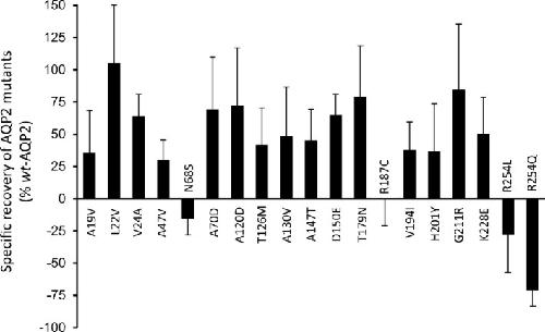 FIGURE 6. Functional recovery distribution in NDI related AQP2 mutations. The functional recovery capacities for 19 AQP2 mutations identified from NDI caseâstudies was performed using the same strategy as previously, i.e. subtracting mutant activities in single expression (â condition) to that found in coexpression (+ condition, see Figure 3). As shown, mutations located in the core structure of the channel (A19V to G211R) all display clear functional recovery properties, with notable exception of N68S and R187C which are part of, or directly adjacent to, the double NPA water selectivity filter (water pore). The two last mutations studied (R254L and R254Q), located in the Câter regulatory segment of the channel, display dominant negative effect typical of dom mutations through inhibition of the wtâAQP2 subunit(s) activity. Values are mean ± SD in % of wtâAQP2, n = 3â5 assays (seesupporting information for p values).