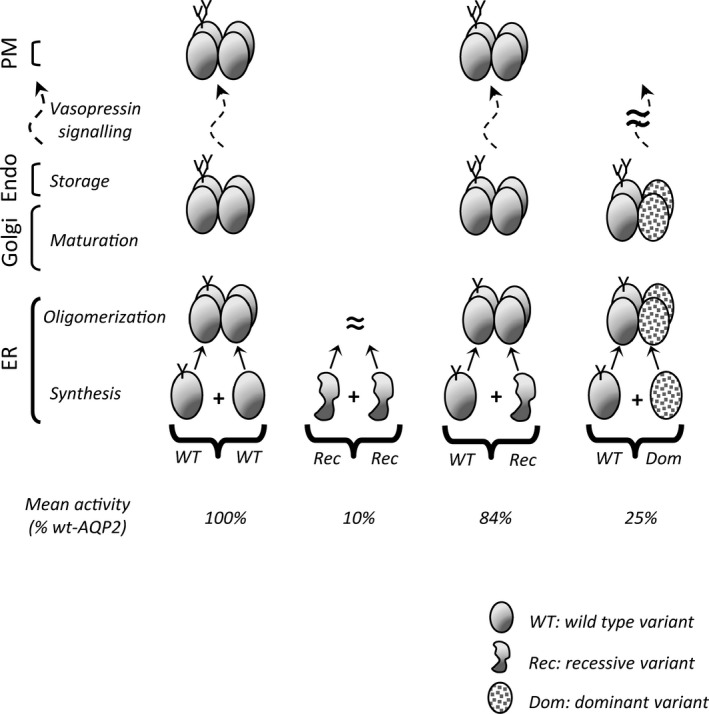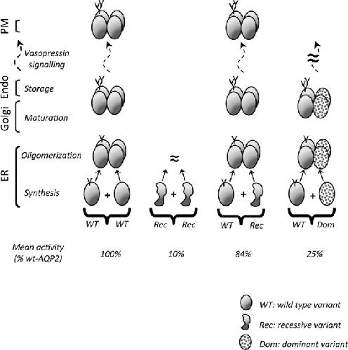 FIGURE 7. Molecular model describing AQP2âdepended NDI. In normal condition (wt/wt), AQP2 proteins are synthesized and assembled (tetramer) in ER before Golgi maturation and final storage in endosomes (Endo). AQP2 particles can therefore be recruited to the plasma membrane (PM) through vasopressin signaling (phosphorylation of Câter segment) and recycled on demand. Defective rec forms found within the core structure of the protein fail to produce functional tetramers in sufficient amount to support adequate level of activity, hence inducing NDI phenotype in homozygous rec/rec conditions (mean activity = 11% of wt/wt condition). Yet, aside a few exceptions (N68S, R187C), the same variants in heterozygous condition (wt/rec) can associate with wt counterparts to create functional wt/rec heteromers, increasing overall activity (87% of wt/wt condition) so to prevent NDI phenotype. Although dominant (dom) mutations also multimerize with wt, the wt/dom heteromers are mostly found to be sequestered (Golgi, endosomes), lowering global activity and causing NDI even in heterozygotes (25% of wt/wt condition).