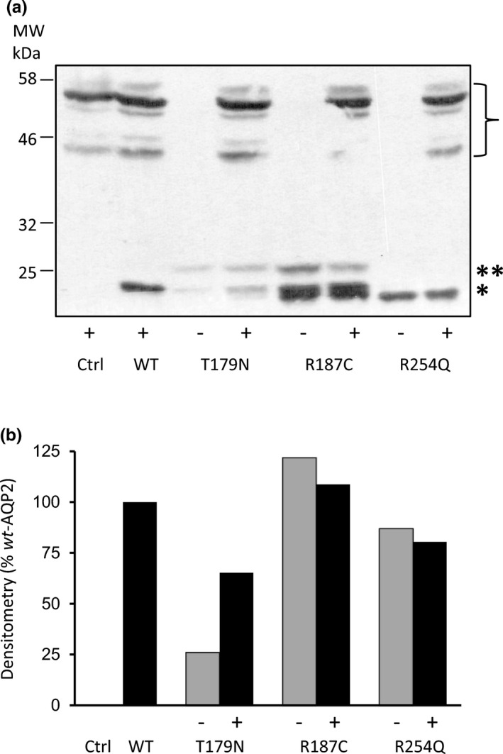 FIGURE 4. Quantization of protein abundance for AQP2 variants in wt/mutant conditions. The conditions tested in Figure 3 for functionality were also used to evaluate the protein stability for each mutant variant, this time using equimolar amount of GFPâwtâAQP2 in (+) condition in order to isolate the untagged signal of mutant forms for densitometry analysis (GFPâwtâAQP2 in bracket). Western blots in panel (a) represent the specific labeling for each mutant either in absence (â) or presence (+) of GFPâwtâAQP2. Here again, both nonâglycosylated (*) and highâmannose bands (**) are shown. (b) Densitometry analysis for each condition displayed in (a) combining both 29Â kDa (*) and 31Â kDa (**) bands and presented in % values against WT.