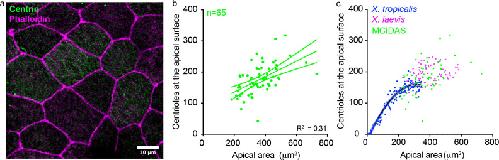 Figure 1—figure supplement 1. Relation between centriole number and apical area in goblet cells converted to MCCs in Xenopus laevis.(a) MCCs marked with centrin-GFP (centrioles, green), and phalloidin (F-actin, magenta) in Xenopus laevis. (b) Regression plot showing the relation between apical area and centriole number in MCCs induced by overexpressing mcidas in X. laevis embryos and (c) comparison to control X. laevis and X. tropicalis embryos. n = number of cells collected from five embryos. The data is uploaded as source data 1. |