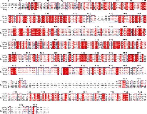 Figure 1. Alignment of amino acid sequences of SLC26A5 of mouse, gerbil, Xenopus, and bullfrog. Different colors had been used to represent identity of each residue among four species. Red block: full identity at a residue; red letter: partial identity at a residue; black: complete disparity at a residue. Gaps in the aligned sequences were indicated by the dashed line.