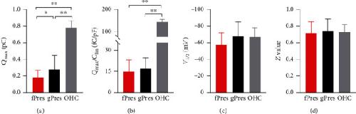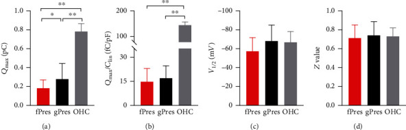 Figure 3. NLC functions of fPres, gPres, and mouse OHC. (a–d) Showed four parameters derived from curve fittings with Boltzmann's function for fPres (n = 16), gPres (n = 15), and OHC (n = 6). Data were expressed as mean ± s.d. ∗P < 0.05, ∗∗P < 0.01.