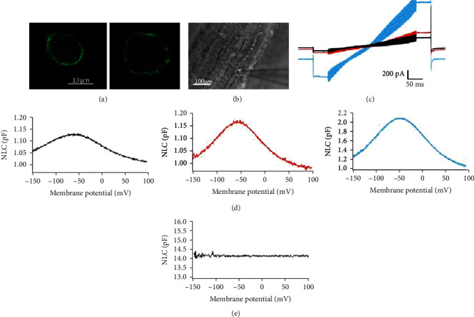Figure 2. Nonlinear capacitance obtained from gPres- and fPres-transfected cells and a mouse OHC. (a) Confocal microscopy images of HEK cells transfected by gPres and fPres. (b) OHC patch. (c) Whole-cell currents of gPres- and fPres-transfected cells and OHC. Cells were held at -80 mV for current recordings. Voltage steps (300 ms in duration) varied from -150 to 100 mV in 10 mV steps. Black-gPres, red-fPres, blue-OHC. (d) NLC obtained from gPres- and fPres-transfected cells. Black-gPres, red-fPres. NLC obtained from the mouse OHC, blue curve. (e) This one showed the lack of detectable NLC in a representative control cell.