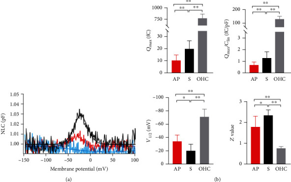 Figure 5. NLC functions of frog's three auditory organs (AP, BP, and S). (a) NLC obtained from the hair cells of three auditory organs. Red: the amphibian papilla (AP); black: the sacculus (S); blue: the basilar papilla (BP). No NLC was detected in the hair cells of the basilar papilla (BP). (b) Four parameters derived from curve fittings with Boltzmann's function for AP (n = 10) and S (n = 8). Mouse OHC was used as a comtrol. Data are expressed as mean ± s.d. ∗∗P < 0.01, ∗P < 0.05 (Student's t-test).
