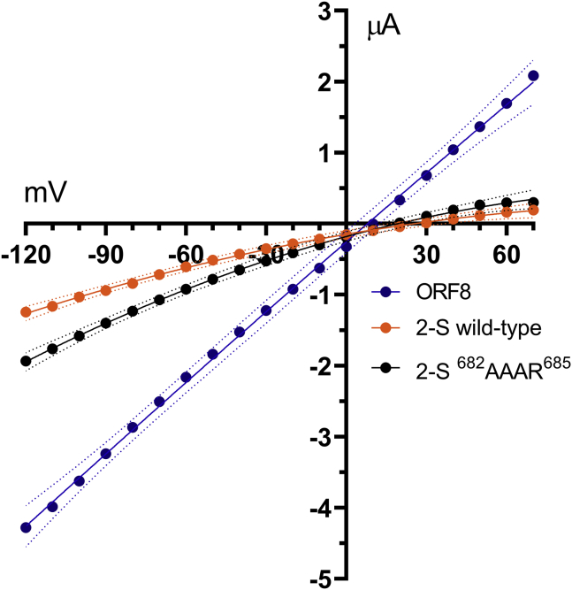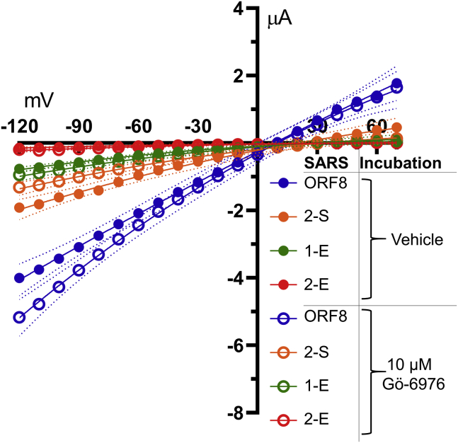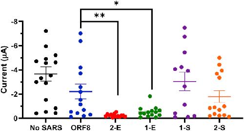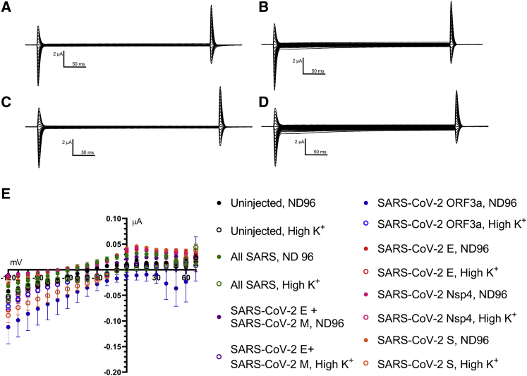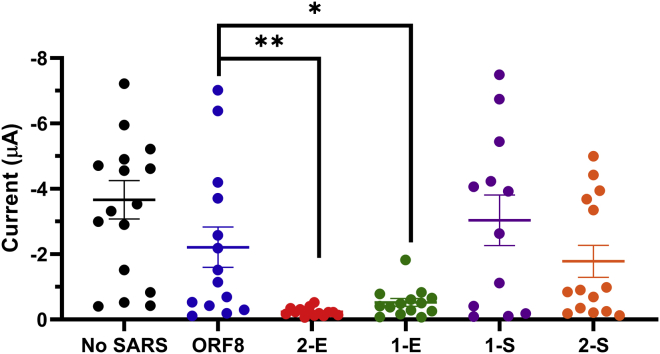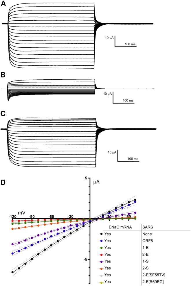 Severe acute respiratory syndrome (SARS) coronavirus (CoV) 2 (SARS-CoV-2), which causes the coronavirus disease 2019, encodes several proteins whose roles are poorly understood. We tested their ability either to directly form plasma membrane ion channels or to change functions of two mammalian plasma membrane ion channels, the epithelial sodium channel (ENaC) and the α3β4 nicotinic acetylcholine receptor. In mRNA-injected Xenopus oocytes, none of nine SARS-CoV-2 proteins or two SARS-CoV-1 proteins produced conductances, nor did co-injection of several combinations. Immunoblots for ORF8, spike (S), and envelope (E) proteins revealed that the proteins are expressed at appropriate molecular weights. In experiments on coexpression with ENaC, three tested SARS proteins (SARS-CoV-1 E, SARS-CoV-2 E, and SARS-CoV-2 S) markedly decrease ENaC currents. SARS-CoV-1 S protein decreases ENaC currents modestly. Coexpressing the E proteins but not the S proteins with α3β4 nicotinic acetylcholine receptors significantly reduces acetylcholine-induced currents. ENaC inhibition does not occur if the SARS-CoV protein mRNAs are injected 24 h after the ENaC mRNAs, suggesting that SARS-CoV proteins affect early step(s) in functional expression of channel proteins. Consistent with the hypothesis that the SARS-CoV-2 S protein-induced ENaC inhibition involves competition for available protease, mutating the furin cleavage site in SARS-CoV-2 S protein partially relieves inhibition of ENaC currents. Extending previous suggestions that SARS proteins affect ENaC currents via protein kinase C (PKC) activation, PKC activation via phorbol 12-myristate 13-acetate decreases ENaC and α3β4 activity. Phorbol 12-myristate 13-acetate application reduced membrane capacitance ∼5%, presumably via increased endocytosis, but this decrease is much smaller than the SARS proteins' effects on conductances. Also, incubating oocytes in Gö-6976, a PKCα and PKCβ inhibitor, did not alter E or S protein-induced channel inhibition. We conclude that SARS-CoV-1 and SARS-CoV-2 proteins alter the function of human plasma membrane channels, via incompletely understood mechanisms. These interactions may play a role in the coronavirus 2019 pathophysiology.