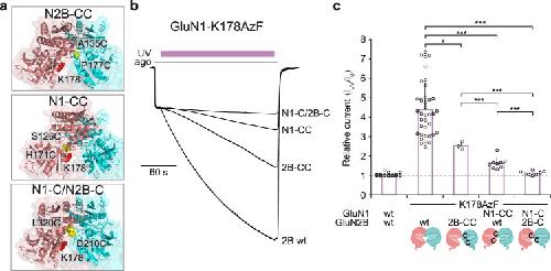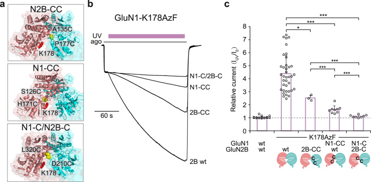 Fig. 2. Photopotentiation necessitates inter-subunit mobility of the GluN1/GluN2B NTD heterodimer.a Location of each double cysteine mutations (CC) in the GluN1/GluN2B NTD heterodimer (PDB 4PE5, Ref. 10). Mutant receptors are GluN1-K178AzF/GluN2B-A135C-P177C (2B-CC), GluN1-S126C-H171C-K178AzF/GluN2B wt (N1-CC) and GluN1-K178AzF-L320C/GluN2B-D210C (N1-C/2B-C). Introduced cysteines are highlighted as yellow spheres and the GluN1-K178 position as red spheres. b Responsiveness of disulfide-bond linked mutant receptors to UV illumination (365 nm). Representative current traces measured from oocytes expressing wild-type (wt) or various cysteine mutant receptors (as described in a) during UV illumination. Note that the UV-induced potentiation is almost completely lost on receptors with inter-subunit disulfide bond cross-linked NTDs (N1C/2B-C). ago, for agonists (glutamate and glycine, 100 µM each). c Change in current amplitude upon UV illumination (Iuv/Io) of wild-type (wt) GluN1/GluN2B receptors and cysteine mutant receptors (as described in a). Values are: 1.04 ± 0.09 (n = 16) for wt, 4.39 ± 1.40 (n = 37) for GluN1-K178AzF/GluN2B, 2.52 ± 0.21 (n = 3) for 2B-CC, 1.63 ± 0.29 (n = 9) for N1-CC and 1.12 ± 0.10 (n = 8) for N1-C/2B-C. Bottom cartoons illustrate the introduced disulfide bond pair and their impact on NTD clamshell closure. Data represent mean ± SD. n = number of biologically independent cells. *P = 0.030, ***P < 0.001 (one-way ANOVA). |