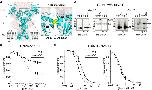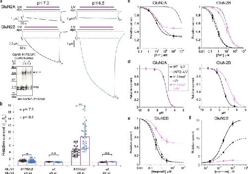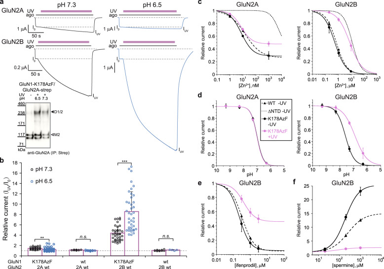 Fig. 3. Photocrosslinking differentially affects allosteric modulation of GluN2A and GluN2B receptors.a Representative current traces from oocytes expressing GluN1-K178AzF/GluN2A receptors (top traces) and GluN1-K178/GluN2B receptors (bottom traces) during UV illumination. Experiments were performed at pH 7.3 (left, black) or pH 6.5 (right, blue). ago, for agonists. Inset: immunoblots from HEK cells expressing GluN1-K178AzF/GluN2A-Strep mutant receptors and exposed to UV (+) or not (â) at pH 6.5 or 7.3. GluN2A-Strep monomer (M2) is expected to run at ~130âkDa, and GluN1/GluN2A heterodimer (D1/2) at ~240âkDa. b Change in current amplitude upon UV illumination (Iuv/Io) of wild-type (wt) receptors and GluN1-K178AzF/GluN2A and GluN1-K178azF/GluN2B mutant receptors, recorded either at pH 7.3 or 6.5. Values are, from left to right: 1.45â±â0.23 (nâ=â32) and 1.23â±â0.37 (nâ=â58) for AzF mutant GluN2A receptors; 1.09â±â0.10 (nâ=â10) and 1.04â±â0.07 (nâ=â12) for wt GluN2A receptors; 4.39â±â1.40 (nâ=â37) and 8.59â±â3.71 (nâ=â41) for AzF mutant GluN2B receptors; 1.04â±â0.09 (nâ=â16) and 1.14â±â0.09 (nâ=â4) for wt GluN2B receptors. Data represent meanâ±âSD. nâ=ânumber of biologically independent cells. **Pâ=â0.004, ***Pâ<â0.001, n.s. non-significant (Pâ=â0.22 for wt GluN2A and 0.06 for wt GluN2B) (one-way ANOVA). c Zinc sensitivity of GluN1-K178AzF/GluN2A receptors (left) and GluN1-K178/GluN2B receptors (right), before (plain black line) and after (violet) UV treatment. Dashed line, wt receptors; dotted line, GluN2-ÎNTD receptors80. Values of Zn2+ IC50, maximal inhibition (for GluN2A receptors) and Hill slope (nH) are: 7.43â±â1.10ânM, 0.70â±â0.03 and 0.99â±â0.09 (nâ=â4) before UV, and 7.69â±â0.17ânM, 0.52â±â0.04 and 1.05â±â0.07 (nâ=â3) after UV for GluN1-K178AzF/GluN2A; 15.33â±â2.99ânM, 0.74â±â0.05 and 0.70â±â0.03 (nâ=â4) for wt GluN1/GluN2A; 0.54â±â0.01âμM and 1.02â±â0.02 (nâ=â4) before UV, and 7.96â±â0.16âµM and 0.91â±â0.02 (nâ=â3) after UV for GluN1-K178AzF/GluN2B; 0.72â±â0.03âμM and 1.08â±â0.04 (nâ=â4) for wt GluN1/GluN2B. Data represent meanâ±âSD. nâ=ânumber of biologically independent cells. d Proton sensitivity. Conditions as in c. Values of pHIC50 and Hill slope (nH) are: 7.00â±â0.02 and 1.91â±â0.11 (nâ=â9) before UV, and 7.01â±â0.01 and 1.93â±â0.07 (nâ=â10) after UV for GluN1-K178AzF/GluN2A; 7.60â±â0.01 and 1.37â±â0.05 (nâ=â7â9) before UV; and 6.90â±â0.02 and 0.99â±â0.03 (nâ=â5â6) after UV for GluN1-K178AzF/GluN2B. Data represent meanâ±âSD. nâ=ânumber of biologically independent cells. e Ifenprodil sensitivity of GluN1-K178AzF/GluN2B receptors before (plain black line) and after (violet) UV treatment. Dashed line, wt GluN1/GluN2B receptors. Values of ifenprodil IC50, maximal inhibition and Hill slope (nH) are: 0.32â±â0.02âµM, 0.95â±â0.02 and 1.22â±â0.04 (nâ=â3) for wt; 0.24â±â0.06âµM, 0.98â±â0.09 and 1.25â±â0.39 (nâ=â4) before UV; and 0.40â±â0.12âµM, 0.54â±â0.06 and 1.25â±â0.11 (nâ=â4) after UV for GluN1-K178AzF/GluN2B. Data represent meanâ±âSD. nâ=ânumber of biologically independent cells. f Spermine sensitivity. Conditions as in e. Values of spermine EC50, maximal potentiation and nH are: 174.3â±â64.5âμM, 11.2â±â3.3 and 1.26â±â0.09 (nâ=â3â5) for wt; 214.9â±â63.2âμM, 26.1â±â2.5 and 1.29â±â0.22 (nâ=â4) before UV; and 93.0â±â22.8âμM, 1.6â±â0.5 and 1.14â±â0.16 (nâ=â5) after UV for GluN1-K178AzF/GluN2B. Data represent meanâ±âSD. nâ=ânumber of biologically independent cells. |