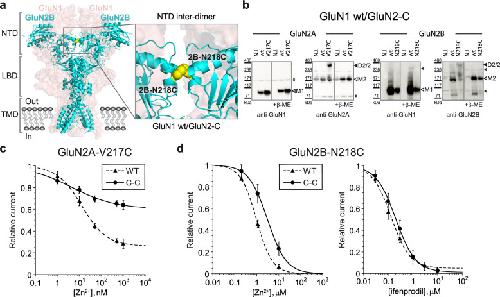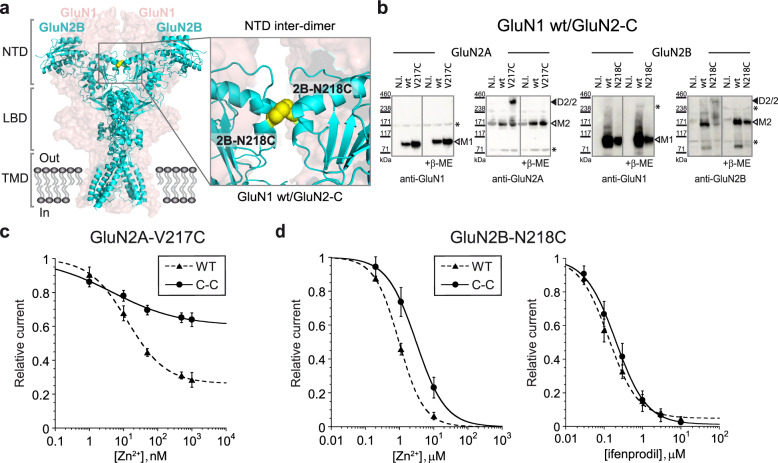 Fig. 4. Restraining NTD inter-dimer conformational mobility differentially affects GluN2A and GluN2B allostery.a Structure of the full-length GluN1/GluN2B receptors (inhibited state PDB 4PE5, Ref. 10) with the location of the engineered cysteine mutation highlighted (yellow spheres). The two GluN2 subunits are shown in cartoon representation while the two GluN1 subunits in the back are displayed in space-filled. Inset: enlargement of the region with the pair of cysteines introduced to form a disulfide bond at the NTD inter-dimer interface made by the two adjacent GluN2 NTD lower lobes. b Immunoblots from Xenopus oocytes expressing GluN1/GluN2A-V217C or GluN1/GluN2B-N218C mutant receptors. Samples were analyzed using anti-GluN1 and anti-GluN2A or anti-GluN2B antibodies. GluN1 monomer (M1) runs at ~110 kDa (M1), GluN2A and GluN2B monomer at ~180 kDa (M2), and GluN2 homodimer at ~360 kDa (D2/2). * indicates non-specific background bands. “± β-ME” indicates immunoblots performed with or without β-mercaptoethanol, i.e., in reducing or non-reducing conditions. N.I. for non-injected oocytes. c Zinc inhibition dose-response curves of GluN1/GluN2A-V217C receptors (C-C, plain line). For comparison, zinc sensitivity of wild-type GluN1/GluN2A receptors (wt, dashed line) is also shown. Values of Zn2+ IC50, maximal inhibition and Hill slope (nH) are: 4.64 ± 1.78 nM, 0.40 ± 0.03 and 0.44 ± 0.08 (n = 7–13) for C-C; 12.99 ± 1.12 nM, 0.74 ± 0.01 and 0.77 ± 0.05 (n = 7–18) for wt. Data represent mean ± SD. n = number of biologically independent cells. d Zinc (left) and ifenprodil (right) inhibition dose-response curves of GluN1/GluN2B-N218C receptors (C-C, plain lines). For comparison, zinc and ifenprodil sensitivity of wild-type (wt) GluN1/GluN2B receptors are also shown (dashed lines): Values of Zn2+ IC50 and Hill slope (nH) are: 3.06 ± 0.04 μM and 1.01 ± 0.01 (n = 5) for C-C vs 0.97 ± 0.03 μM and 1.20 ± 0.04 (n = 4) for wt. Values of ifenprodil IC50, maximal inhibition and Hill slope (nH) are: 0.20 ± 0.01 μM, 0.99 ± 0.02 and 1.08 ± 0.06 (n = 5–15) for C-C; 0.13 ± 0.01 μM, 0.95 ± 0.02 and 1.14 ± 0.11 (n = 9–16) for wt. Data represent mean ± SD. n = number of biologically independent cells. |