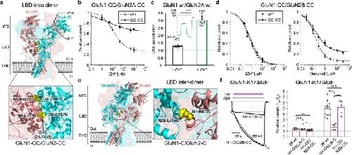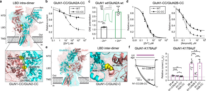 Fig. 5. Inter-layer NTD-LBD coupling differs between GluN2A and GluN2B receptors.a Structure of the full-length GluN1/GluN2B receptors (inhibited state PDB 4PE5, Ref. 10) with the four engineered cysteine mutations at the LBD intra-dimer interface highlighted (yellow spheres). The NTD binding sites for the negative allosteric modulators ifenprodil and zinc are indicated. Inset: enlargement of the region with cysteines introduced. The binding site for GNE-3419, a GluN2A-selective positive allosteric modulator (PAM) is also highlighted (green spot). b Zinc sensitivity of GluN1-N521C-L777C/GluN2A-E516C-L780C (CC/CC) receptors (plain line). Dashed line, wild-type (wt) GluN1/GluN2A receptors. Values of Zn2+ IC50, maximal inhibition and Hill slope (nH) are: 3.44â±â2.03ânM, 0.37â±â0.04 and 0.40â±â0.11 (nâ=â4â14) for CC-CC; 12.99â±â1.12ânM, 0.74â±â0.01 and 0.77â±â0.05 (nâ=â7â18) for wt. Data represent meanâ±âSD. nâ=ânumber of biologically independent cells. c Potentiation of wt GluN1/GluN2A receptors by GNE-3419 (100âµM) in the absence or presence of the GluN2A NTD inhibitor zinc (100ânM). Values are: 1.27â±â0.04 (nâ=â9) without zinc and 3.01â±â0.32 (nâ=â10) in zinc. Inset: Effect of GNE-3419 in the presence of zinc. GNE-3419 application fully reverses zinc inhibition of GluN2A receptors ago, for agonists. Data represent meanâ±âSD. nâ=ânumber of biologically independent cells. ***Pâ<â0.001 (two-sided Studentâs t test). d Zinc (left) and ifenprodil (right) inhibition dose-response curves of GluN1-N512C-L777C/GluN2B-E517C-L781C receptors (CC-CC, plain lines). Dashed line, wt GluN1/GluN2B receptors. Values of Zn2+ IC50 and Hill slope (nH) are: 0.72â±â0.05âμM and 0.88â±â0.05 (nâ=â4) for CC-CC vs 0.59â±â0.06âμM and 0.96â±â0.10 (nâ=â2â3) for wt. Values of ifenprodil IC50, maximal inhibition and Hill slope (nH) are: 0.17â±â0.03âμM, 0.76â±â0.03, nHâ=â0.83â±â0.13 (nâ=â7â8) for CC-CC; 0.15â±â0.01âμM, 0.93â±â0.01 and 1.11â±â0.07 (nâ=â4â5) for wt. Data represent meanâ±âSD. nâ=ânumber of biologically independent cells. e Structure of the full-length GluN1/GluN2B receptors (inhibited state PDB 4PE5, Ref. 10) with the two engineered cysteine mutations at the LBD inter-dimer interface highlighted (yellow spheres). Inset: enlargement of the region with cysteines. f Responsiveness of disulfide-bond linked mutant receptors to UV illumination (365ânm). Left: Representative current traces from oocytes expressing GluN1-K178AzF/GluN2B wt, GluN1-K178AzF-R673C/GluN2B-L795C (N1-C/2B-C) or GluN1-K178AzF-N512C-L777C/GluN2B-E517C-L781C (N1-CC/2B-CC) receptors during UV illumination. ago, for agonists. Right: change in current amplitude upon UV illumination (Iuv/Io) of GluN1-K178AzF/GluN2A wt receptors, GluN1-K178AzF/GluN2B wt receptors, and cysteine mutant receptors. Values are: 1.38â±â0.15 (nâ=â8) for GluN1-K178AzF/GluN2A wt; 1.29â±â0.06 (nâ=â6) for N1-C/N2A-C (GluN1-K178AzF-R673C/GluN2A-L794C) and 1.18â±â0.11 (nâ=â12) for N1-CC/2A-CC; 4.95â±â1.31 (nâ=â12) for GluN1-K178AzF/GluN2B wt; 1.68â±â0.56 (nâ=â6) for N1-C/N2B-C and 5.17â±â1.18 (nâ=â5) for N1-CC/2B-CC. Data represent meanâ±âSD. nâ=ânumber of biologically independent cells. *Pâ=â0.034, **Pâ=â0.003, ***Pâ<â0.001, n.s. non-significant (Pâ=â0.21 for GluN2A and 0.75 for GluN2B) (one-way ANOVA). |