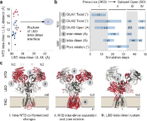 Fig. 7. Long-distance allosteric coupling in GluN2A receptors.a The relationship between the NTD intra-dimer distance and the LBD intra-dimer distance as extracted from 29 available full-length X-ray and cryo-EM NMDAR structures (see “Methods”). Same representation as in Fig. 6f, with blue and red colors for GluN2A and GluN2B receptor structures, respectively, and with an additional GluN2A receptor structure captured in a “splayed open” conformation15 (blue cross). Note that the GluN2A receptor “splayed open” structure displays a disrupted LBD intra-dimer interface but an intact NTD intra-dimer interface. NTD N-terminal domain, LBD ligand-binding domain, UL upper lobe, LL lower lobe. b, c iMODfit simulations on a full-length GluN2A receptor from the “pre-active” state to the “splayed-open” state (2KS-6MMR and SO-6MMI, respectively; Ref. 15). b Evolution of selected collective variable during the iMODFit simulation. The trajectory is segmented into four consecutive steps (I to IV). Displacement values greater than 2 Å or 6 degree angle between the starting and the targeted structures are indicated within the corresponding rectangles. c Conformational changes experienced by the GluN2A receptor when transiting from the “pre-active” to “splayed-open state” (steps I to III). Red arrows represent protein displacements occurring during each step. Circled numbers refer to the collective parameters analyzed in panel (b). Note that during step III, the LBD intra-dimer interface experiences large structural rearrangement eventually leading to its disruption. |