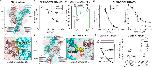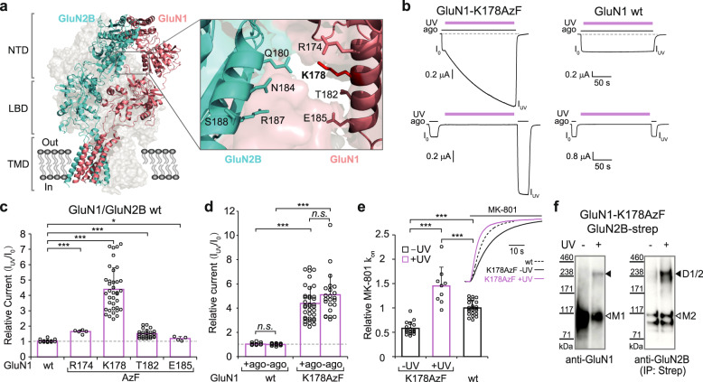 Fig. 1. NTD heterodimer photocrosslinking locks GluN2B receptors in a high Po mode.a Structure of the full-length GluN1/GluN2B receptor in the inhibited state (side view; PDB 4PE5, Ref. 10 and see âMethodsâ). The receptor, composed of two GluN1 subunits and two GluN2B subunits, assembles as a dimer-of-dimers and display a layered arrangement (NTD, LBD, TMD). The two front subunits are shown in cartoon representation while the two subunits in the back are displayed in space-filled. NTD N-terminal domain, LBD ligand-binding domain also named agonist-binding domain, TMD transmembrane domain. Inset: enlargement of the GluN1-GluN2B NTD heterodimer lower lobe region. Residues in GluN1 and GluN2B subunits subjected to amber mutation (allowing incorporation of photo-cross-linker amino acids) are represented as sticks. b Representative current traces from oocytes expressing GluN1-K178AzF/GluN2B mutant (left) and wild-type (wt, right) receptors during UV illumination (365ânm) in the presence (top) or absence (bottom) of agonists. ago, for agonists (glutamate and glycine, 100âµM each). c Change in current amplitude upon UV illumination (Iuv/Io) of wild-type (wt) GluN1/GluN2B receptors and various GluN1-AzF/GluN2B mutant receptors. Values are: 1.04â±â0.09 (nâ=â16) for wt, 1.65â±â0.12 (nâ=â5) for GluN1-R174AzF, 4.39â±â1.40 (nâ=â37) for GluN1-K178AzF, 1.51â±â0.26 (nâ=â25) for GluN1-T182AzF and 1.19â±â0.13 (nâ=â4) for GluN1-E185AzF. Data represent meanâ±âSD. nâ=ânumber of biologically independent cells. *Pâ=â0.011, ***Pâ<â0.001 (one-way ANOVA). d Change in current amplitude upon UV illumination (Iuv/Io) of wt and GluN1-K178AzF/GluN2B mutant receptors during (+ago) or between (âago) agonist application. Values are, from left to right: 1.04â±â0.09 (nâ=â16) for wt +ago; 1.00â±â0.07 (nâ=â14) for wt âago; 4.39â±â1.40 (nâ=â37) for mutant +ago; 5.05â±â1.73 (nâ=â23) for mutant âago. Data represent meanâ±âSD. nâ=ânumber of biologically independent cells. ***Pâ<â0.001, n.s. non-significant (Pâ=â0.25 for wt ± ago, and 0.11 for GluN1-K178AzF ± ago) (one-way ANOVA). e Assessment of receptor channel activity using MK-801 inhibition kinetics. MK-801 kon values were normalized to the mean value obtained with wild-type (wt) GluN1/GluN2B receptors. Relative values are, from left to right: 0.57â±â0.13, (nâ=â19) without UV and 1.45â±â0.38 (nâ=â9) with UV for GluN1-K178AzF/GluN2B; 1.00â±â0.15 (nâ=â23) for wt (no UV). Inset: representative scaled current traces from oocytes expressing wild-type (dashed) or GluN1-K178AzF/GluN2B receptors before (black) and after (violet) UV illumination in response to 50ânM MK-801. Data represent meanâ±âSD. nâ=ânumber of biologically independent cells. ***Pâ<â0.001 (one-way ANOVA). f Immunoblots from HEK cells expressing GluN1-K178AzF/GluN2B mutant receptors and exposed to UV (+) or not (â). Samples were analyzed using anti-GluN1 and anti-Strep antibodies. GluN1 monomer (M1) is expected to run at ~110âkDa, GluN2B-Strep monomer (M2) at ~130âkDa, and GluN1/GluN2B heterodimer (D1/2) at ~240âkDa. âIP: Strepâ indicates the treatment with an immuno-purification procedure using the Strep tag. |