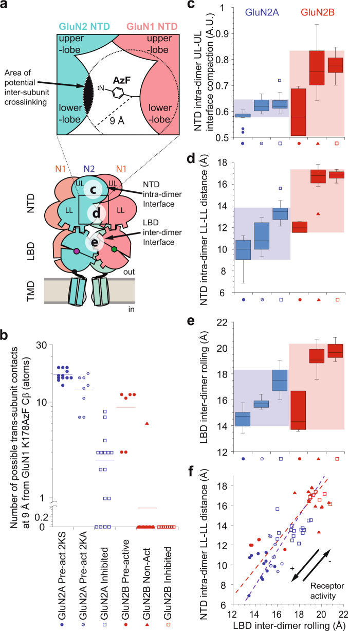 Fig. 6. GluN2A and GluN2B receptors exhibit different conformational landscape.Structural analyses were performed using 29 available full-length NMDAR structures. a Lower panel: Localization of the various regions of interest. Letters (c, d and e) indicate the receptorâ regions where structural parameters were measured, and refer to plots in corresponding panels (c, d and e). Upper panel: Zoom of the (d) region encompassing the lower lobes of the GluN1-GluN2 NTD heterodimer. The estimated region for GluN1-K178AzF photocrosslinking is highlighted as a reaction sphere of 9âà radius from GluN1-K178AzF Cβ57,70. N: reactive nitrene radical, NTD N-terminal domain, LBD ligand-binding domain, TMD transmembrane domain, UL upper lobe, LL lower lobe. b GluN2A and GluN2B receptors differ by their accessibility for inter-subunit cross-linking by the photocrosslinker GluN1-K718AzF. The more atoms lie within the 9âà of AzF Cβ, the closer are the lower lobes within the NTD heterodimer. Horizontal bars represent mean values. Values of n (number of structures) are (from left to right): 12, 8, 16, 6, 16 and 6. c The NTD intra-dimer upper lobe-upper lobe (UL-UL) interface adopts various compactions in GluN2B, but not GluN2A, receptors. The smaller the value of compaction, the lower the distance between the two UL protomers. Boxes display interquartile range, median is shown as center line, whiskers extend from the hinge to the largest and smallest value no further than plus (upper whisker) or minus (lower whisker) 1.5âxâIQR (interquartile range). Values of n (number of structures) are (from left to right): 12, 8, 16, 6, 16 and 6. d The NTD intra-dimer lower lobe-lower lobe (LL) interface displays distinct range of LL separation between GluN2A and GluN2B receptors. Boxes display interquartile range, median is shown as center line, whiskers extend from the hinge to the largest and smallest value no further than plus (upper whisker) or minus (lower whisker) 1.5âxâIQR (interquartile range). Values of n (number of structures) are (from left to right): 12, 8, 16, 6, 16 and 6. e The range of LBD inter-dimer rolling motion47 is greater in GluN2B than in GluN2A receptors. Boxes display interquartile range, median is shown as center line, whiskers extend from the hinge to the largest and smallest value no further than plus (upper whisker) or minus (lower whisker) 1.5âxâIQR (interquartile range). Values of n (number of structures) are (from left to right): 12, 8, 16, 6, 16 and 6. f NTD-LBD conformational coupling is sampled differently in GluN2A and GluN2B receptors. The graph plots the NTD intra-dimer lower lobe-lower lobe (LL) distance as a function the LBD inter-dimer rolling (parameters described in panels d and e, respectively). The dotted lines correspond to linear regressions for all states of GluN2A (blue, Râ=â0.725) and GluN2B (red, Râ=â0.729) receptors. Black arrows indicate the change in level of receptor activity (channel Po), increasing (+) or decreasing (â), according to the receptor conformational state. |