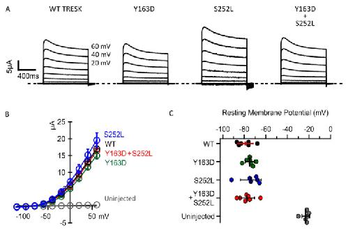 Figure 2. p.Tyr163Asp and p.Ser252Leu do not significantly affect the basal current and ability of TRESK channels to control the cell’s resting potential. (A). Representative families of current traces for the indicated channel types. Cell membrane potential was held at −80mV. Each family of currents was evoked by voltage steps from −120 mV to 60 mV, with 20 mV increments. The recordings were performed 48 h after the injection of 1 ng of mRNA for each channel type. (B). Average IV relationships calculated from experiments as in A for the labelled channel types (color coded). The data points are mean ± standard error (0.001; n = 12). (C). Resting membrane potentials from individual oocytes un-injected (grey dots), injected with 1 ng of WT (black dots) or Y163D (green dots) or S252L (blue dots) or 0.5 ng of each Y163D and S252L (red dots) mRNA and recorded 48 h after injection. Note that the expression of all channel types similarly shifts the resting potential toward K+ reversal potential. The dots in C represent single cell recordings. The data are mean ± standard deviation.