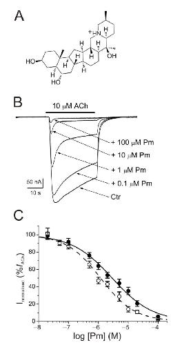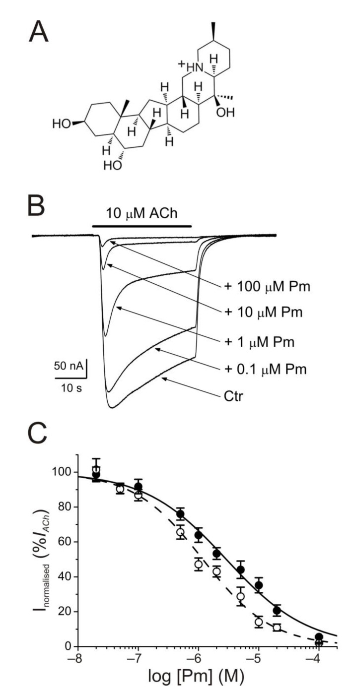 Figure 1. Inhibition of acetylcholine-elicited currents (IAChs) by peimine (Pm). (A) Molecular structure of Pm showing the charged nitrogen. (B) Superimposed IAChs evoked by 10 µM ACh either alone (Ctr) or co-applied with different Pm concentrations, as stated on the right. Note that Pm accelerates IACh decay when applied at concentrations of 0.1 μM or above. Hereafter, unless otherwise stated, the holding potential was −60 mV, downward deflections represent inward currents and the bars above recordings indicate the timing of drug application. (C) Pm concentration-IACh inhibition relationship. IACh amplitudes at their peak (Ip; filled symbols) and at their steady state (Iss, measured 20 s after the peak; open symbols) were normalized to the IACh evoked by ACh alone and plotted against the logarithm of Pm concentration. Solid and dashed lines are sigmoid curves fitted to Ip and Iss data, respectively. Error bars indicate SEM. Each point is the average of 5–16 oocytes from 3–8 frogs.