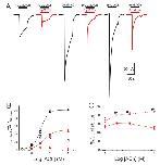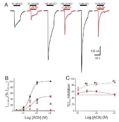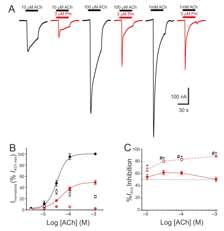 Figure 2. Pharmacological profile of nAChR blockade by Pm. (A) Representative IAChs evoked by ACh at 10 µM (left), 100 µM (middle), or 1 mM (right), either alone (black recordings) or together with 3 µM Pm (red recordings). (B) ACh concentration-IACh amplitude relationship when the cell was bathed with either just ACh (black color; filled symbols denote Ip values whereas open circles correspond to Iss) or ACh plus 3 µM Pm (red symbols). The EC50 values of the sigmoid curves fitting the experimental data were 31 µM (range 11–52 µM) and 47 µM (range 46–49 µM) for control and 3 µM Pm, respectively. (C) Percentage of Ip (solid symbols) and Iss (open symbols) inhibition elicited by 3 µM Pm when co-applied with the indicated ACh concentrations. (*) indicates significant differences between Ip and Iss inhibition, for each ACh concentration (p < 0.05, paired t-test). (#) indicates significant differences among Iss inhibition at 10 µM ACh and other concentrations (p < 0.05, ANOVA followed by Bonferroni t-test). Each point of panels B and C is the average of 4–14 cells from 1–2 donors.