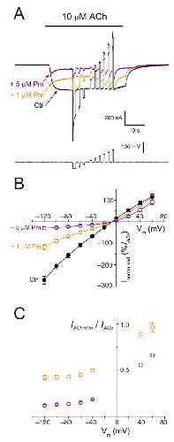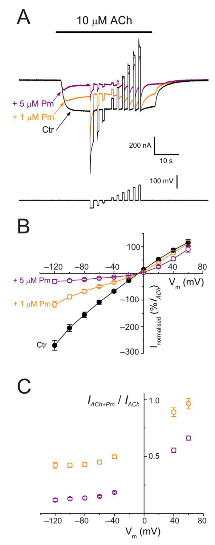 Figure 5. nAChR blockade by Pm is voltage-dependent. (A) IAChs evoked by 10 µM ACh alone (black recording) or in the presence of either 1 (orange) or 5 µM (purple) Pm when applying voltage pulses from −120 to +60 mV, as illustrated underneath. (B) Net i/v relationship of IAChs elicited by the protocol shown in (A). Black symbols are for control IAChs, whereas those evoked in the presence of Pm are drawn in either orange (+1 µM Pm) or purple (+5 µM Pm). Net IAChs were normalized as the percentage of their control IACh at −60 mV (n = 5–11; N = 2–3). (C) Plot displaying the IACh remnant after co-application of either 1 (orange) or 5 µM (purple) Pm (IACh+Pm), normalized to their control (IACh), versus the membrane potential (same cells as in (B)). Notice that 1 µM Pm, in contrast to 5 µM, did not significantly decrease IACh at +60 mV.