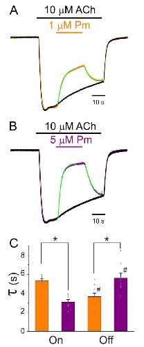 Figure 6. Blockade of open nAChRs by Pm. (A,B) Superimposed IAChs elicited by 50 s pulses of 10 µM ACh either alone (black recordings) or together with 1 (A) or 5 µM (B) Pm, applied at the IACh plateau. Ips were normalized to the same amplitude to facilitate the kinetics comparisons. The kinetics of IACh inhibition and its recovery from blockade followed exponential functions (green traces (A,B)). (C) Column graph of the τ values found for IACh blockade onset (“On” columns) when 1 (orange) or 5 µM (purple) Pm was co-applied with 10 µM ACh. The “Off” columns correspond to the kinetics of recovery (τ) from blockade, following Pm removal (same color code). (*) indicates significant differences of τ values between Pm concentrations for either “On” or “Off” data (p < 0.05, ANOVA and Bonferroni t-test). (#) denotes differences between “On” and “Off” values for either 1 or 5 µM Pm (p < 0.05, paired t-test). Data are for 10 and 8 oocytes (N = 5) for 1 µM and 5 µM Pm, respectively.
