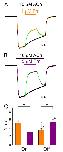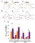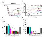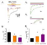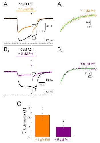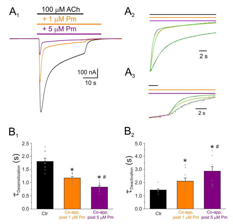 Figure 4. IACh decay and deactivation kinetics depend on Pm concentration. (A1,A2,A3) Representative IAChs elicited by 100 µM ACh either alone (black recording) or together with 1 (orange) or 5 (purple) µM Pm (A1). Pm superfusion remained 12 s after ACh washout (as indicated by the application bars). These recordings were normalized to either the same Ip, to better compare their IACh decay (A2), or the same Iss, to facilitate comparisons of deactivation kinetics (A3). (B1,B2) Column bar plots displaying the effect of 1 (orange) or 5 µM (purple) Pm on the IACh decay time-constant (τDesensitization; (B1)) and the deactivation kinetics (τDeactivation; (B2)), as compared to control IAChs (in the presence of ACh alone; black). (*) indicates significant differences with the control group (p < 0.05, paired t-test) and (#) indicates differences between 1 and 5 µM Pm groups (n = 9, N = 3; the same cells for all comparisons; p < 0.05, paired t-test). Notice that Pm accelerated the desensitization rate and slowed down the deactivation kinetics.
