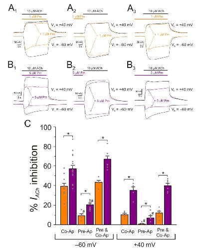 Figure 8. Effect of Pm-application timing and holding potential on nAChR blockade. (A1–A3) IAChs elicited at −60 mV (downward deflections) and at +40 mV (upward deflections) by co-application of 10 µM ACh and 1 µM Pm (A1), solely Pm pre-application before superfusing the agonist (A2) or Pm pre-application followed by its co-application with ACh (A3). (B1–B3) As in panels (A1–A3), but in the presence of 5 µM Pm instead of 1 µM. (C) Column graph shows the percentages of Ip inhibition by Pm when applied as indicated in panels (A1–A3,B1–B3), at −60 mV (on the left) and +40 mV (on the right). (*) indicates significant differences between Ip inhibition elicited by 1 and 5 µM Pm (p < 0.05, t-test). (#) denotes significant differences, for each Pm concentration, among the percentages of Ip inhibition elicited by ACh and Pm co-application and other Pm-application protocols, at the same holding potential (p < 0.05, ANOVA and Bonferroni t-test). Each column is the average of 5–11 and 5–17 oocytes, for −60 mV and +40 mV, respectively.