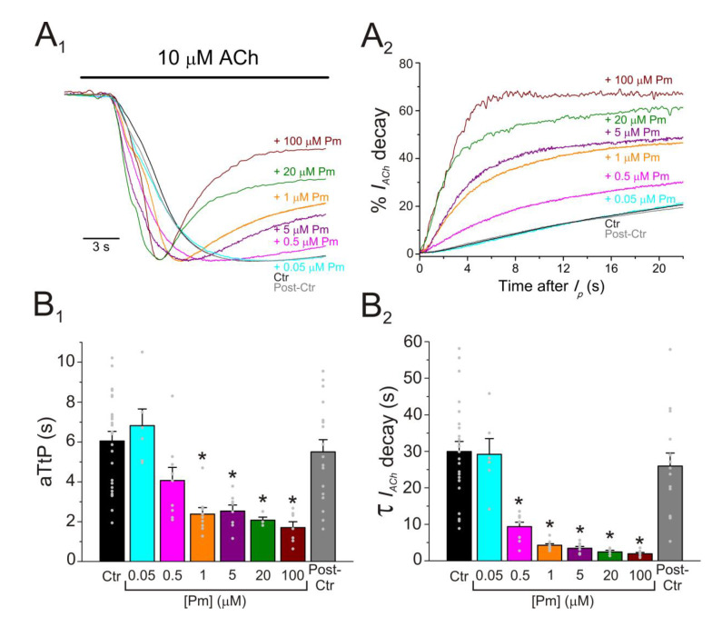 Figure 3. Pm accelerates IACh decay and shortens the time to reach Ip. (A1,A2) Superimposed IAChs elicited by 10 µM ACh either alone (black and grey recordings) or together with different Pm concentrations (shown at right). IAChs were scaled to the same Ip amplitude to better compare the differences in time to reach Ip (aTtP; A1) and kinetics of IACh decay after Ip (A2). (B1,B2) Column graphs displaying Pm effects on aTtP (B1) and τ-values of IACh-decay (B2). (*) indicates significant differences among IAChs in presence of Pm (colored columns; same color code as in (A1,A2)) and their control values (Ctr, black column; p < 0.05, ANOVA and Bonferroni t-test). Note that post-control values (after Pm applications; grey column) were similar to control ones. Each point is the average of 4–24 cells (N = 3–12).