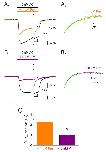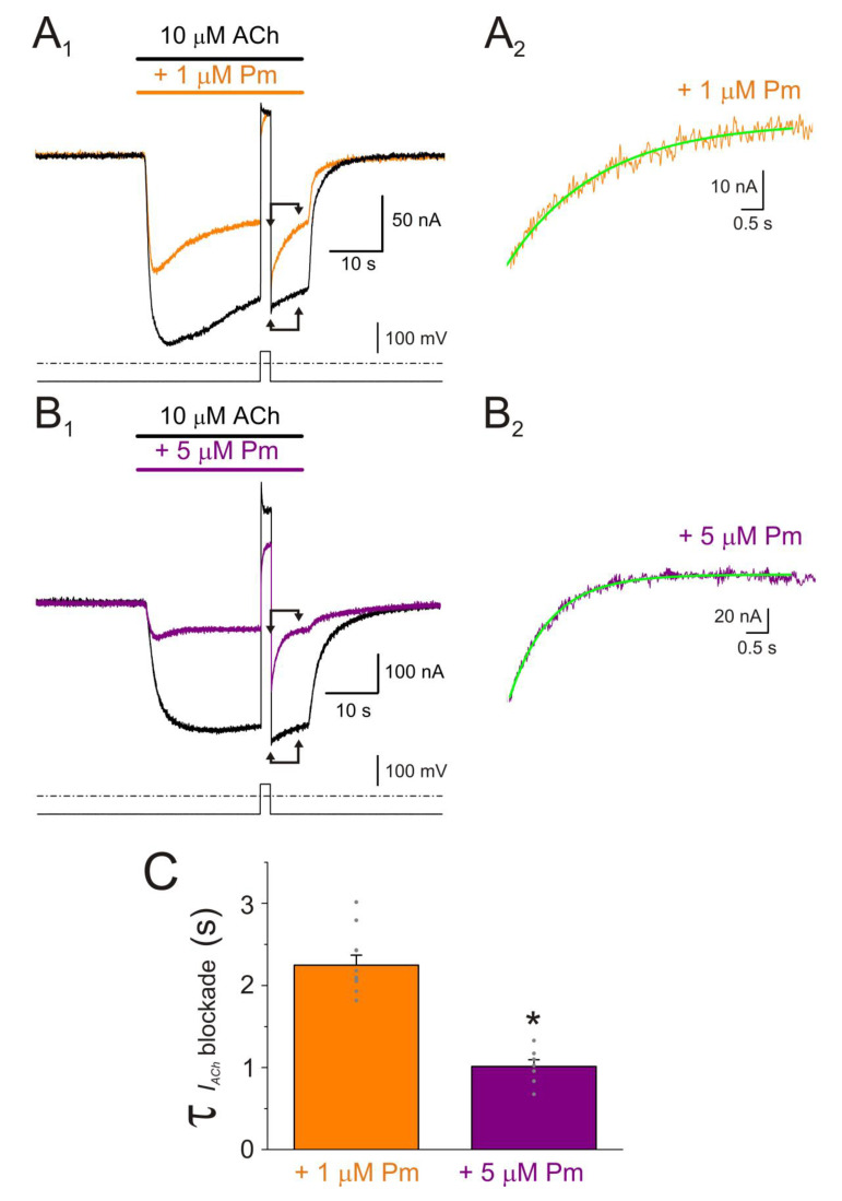 Figure 7. Kinetics of the voltage-dependent blockade of nAChR by Pm. (A1,B1) IAChs elicited by 10 µM ACh either alone (black recordings) or in the presence of 1 (orange; (A1)) or 5 µM (purple; (B1)) Pm, at −60 mV. A 2 s voltage jump to +40 mV was given at the IACh plateau to unplug the channel pore of the positively-charged Pm. Membrane leak-currents (recorded in the absence of ACh) have been subtracted. (A2,B2) Zooming in to the area indicated by the arrows in panels (A1,B1) (just after the voltage jump). The τ of the voltage-dependent blockade of nAChRs by Pm was determined by fitting an exponential function (green curve over the recording) to the net IACh decay. Before fitting, the smaller and slower IAChs evoked by ACh alone (black recordings of panels (A1,B1)) were subtracted from the IAChs in the presence of Pm. (C) Column-graph of τ values of the voltage-dependent blockade of nAChR by 1 and 5 µM Pm (same color code as in panels (A,B)). (*) indicates significant differences of τ values between both Pm concentrations (p < 0.05, t-test). Data are for 10 (N = 3) and 7 (N = 2) oocytes for 1 µM and 5 µM Pm, respectively.