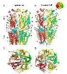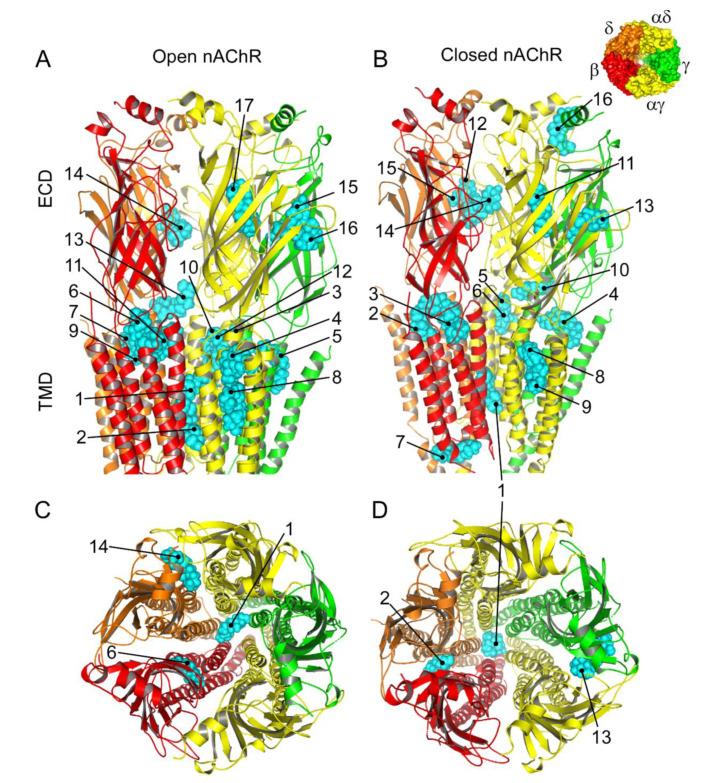 Figure 9. Predicted binding sites for Pm-nAChR complexes. (A,B) Lateral view of the nAChR displaying the main Pm (labelled in cyan) clusters bound to the open (A) and closed (B) conformations. The predicted loci are numbered consecutively, beginning in the transmembrane (TMD) and later in the extracellular (ECD) domain. (C, D) Top view of the nAChR (from the synaptic cleft) displaying representative Pm clusters binding to residues located within the channel pore, TMD, and ECD in the open (C) and closed (D) conformations. The inset, in the upper right corner, displays the nAChR subunits with their color code.