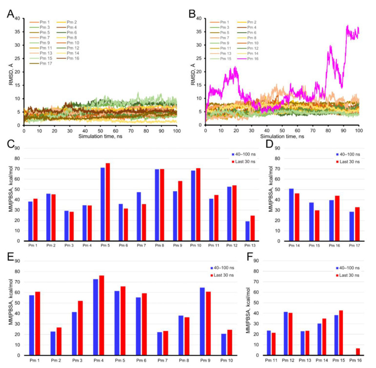 Figure 10. Analysis of MD simulations for Pm bound to the ECD and TMD of nAChR in open and closed conformations. Panels (A) (open conformation) and (B) (closed conformation) display the trajectory through a 100 ns simulation of a Pm molecule sited in each main cluster at the TMD and the ECD, as numbered in Figure 9A,B. Panels (C) (TMD, open), (D) (ECD, open), (E) (TMD, closed), and (F) (ECD, closed) display the free energy analysis (MM|PBSA) of the Pm-nAChR complexes at two MD trajectory intervals (40 to 100 ns and the last 30 ns). YASARA-calculated binding energy provides positive values when the predicted binding is strong and stable, whereas negative values indicate unstable or no binding.