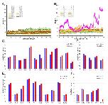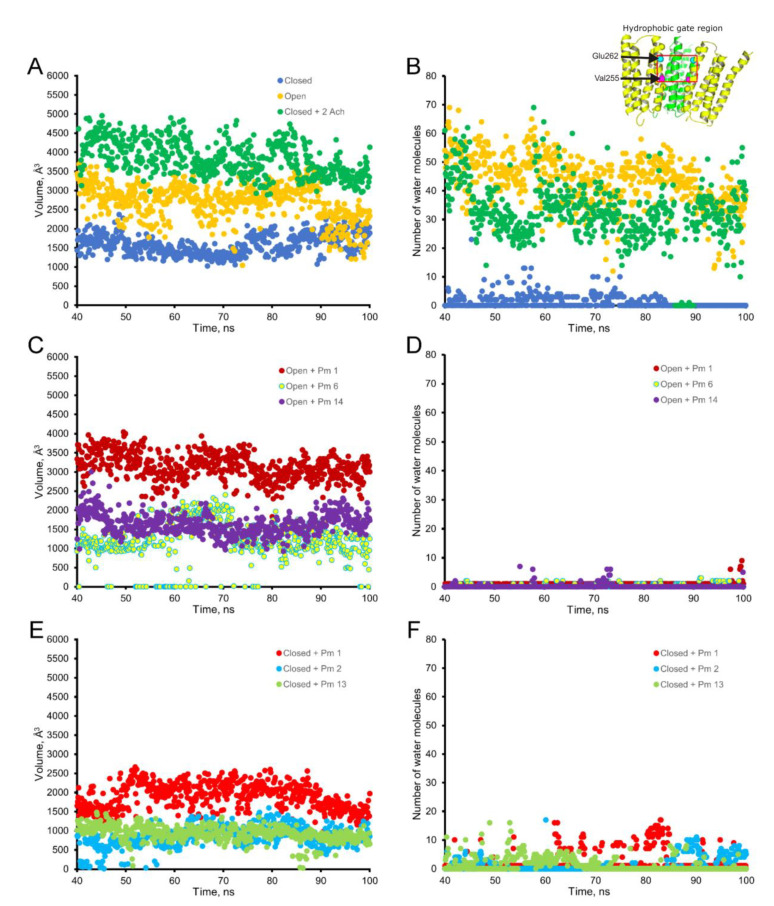 Figure 11. Empty volume (left panels) and number of water molecules (right panels) within the hydrophobic gate of the nAChR pore region (between Val255 and Glu262 of the alpha subunit; see inset in the upper right corner), through the period of 40 to 100 ns of MD simulations. Top panels show the empty volume (A) and the number of water molecules (B) at the hydrophobic gate region in control nAChR (in the absence of Pm), both in the open (yellow) and the closed (blue) conformations; also, it displays the effect of ACh on the closed conformation (green). Middle panels (C,D) display the effect of Pm on these parameters when located at representative sites of the nAChR in the open conformation: within the channel pore (Pm 1), at the TMD (Pm 6), and the ECD (Pm 14). Lower panels (E,F) demonstrate the effect of Pm at representative loci of the nAChR in the closed conformation: inside the channel (Pm 1), at TMD (Pm 2), and at ECD (Pm 13).