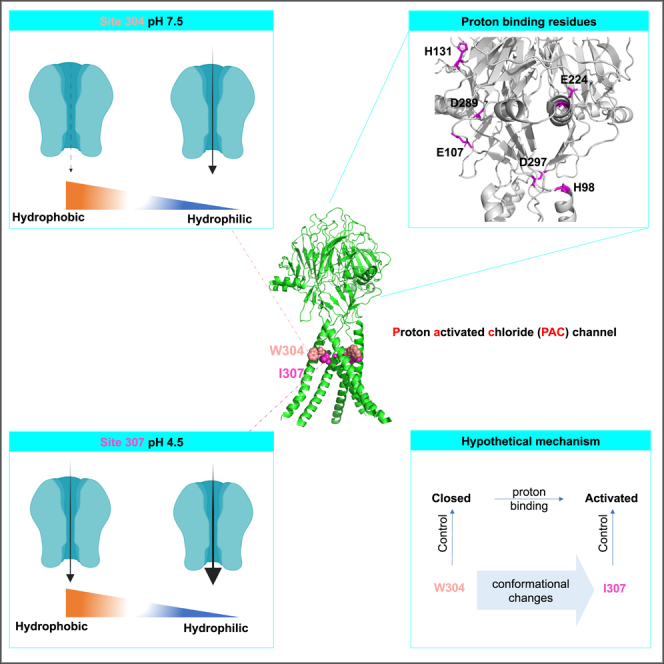Figure 3. Functional effects of double hydrophilic mutations at W304 and I307(A) Statistical I-V curves obtained from oocytes expressing WT, W304Q/I307Q, or W304N/I307N at pH 7.5 (filled) or 4.5 (open).(B) Averaged currents at +80 mV obtained from oocytes expressing WT or a double mutant at pH 7.5 or 4.5. ∗∗∗, p < 0.001; ns, not significant compared with the WT current at pH 4.5.(C) Total and surface expression of PAC-Flag or β-actin in oocytes similarly prepared as in panel B (left panel) and statistical analysis (right panel). ns, not significant, compared with WT by Student's t-test.Data are represented as mean ± SEM.