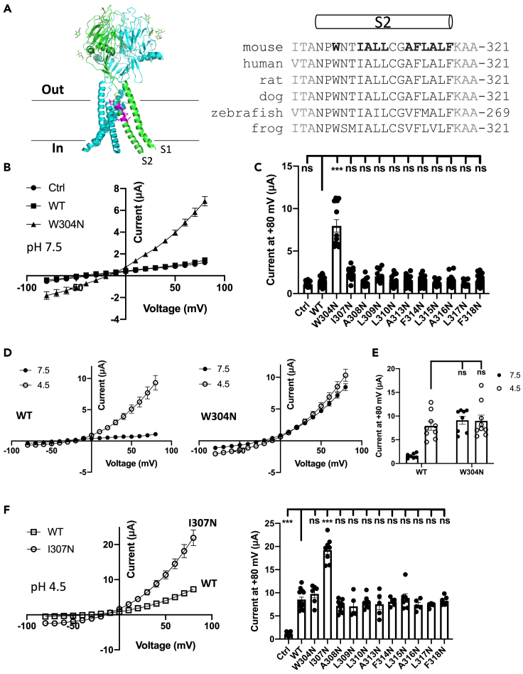 Figure 1. Effects of hydrophobic residues within helix S2 on the PAC function(A) Left panel: structure of human PAC with hydrophobic candidate residues (W304, I307, A308, L309, L310, A313, F314, L315, A316, L317, F318 in magenta, PDB: 7JNA). Right panel: sequence alignment of the PAC S2 helix across species.(B) Statistical I-V curves obtained from oocytes expressing WT PAC, mutant W304N, or from water-injected oocytes (Ctrl) bathed with the pH 7.5 solution (see STAR Methods).(C) Bar charts of averaged currents at +80 mV from oocytes expressing WT or mutant PAC, as indicated. ∗∗∗, p < 0.001; ns, not significant compared with WT PAC.(D) Statistical I-V curves obtained from oocytes expressing WT PAC (left) or mutant W304N (right) at pH 7.5 (filled circle) or pH 4.5 (open circle).(E) Averaged currents obtained from WT PAC or W304N expressing-oocytes at pH 7.5 or 4.5.(F) Left panel: Statistical I-V curves corresponding to WT channel (open circle) or I307N (open square) at pH 4.5. Right panel: averaged currents for water-injected, WT PAC, or an indicated mutant at pH 4.5.Data are represented as mean ± SEM. Also, see Figures S1 and S2.