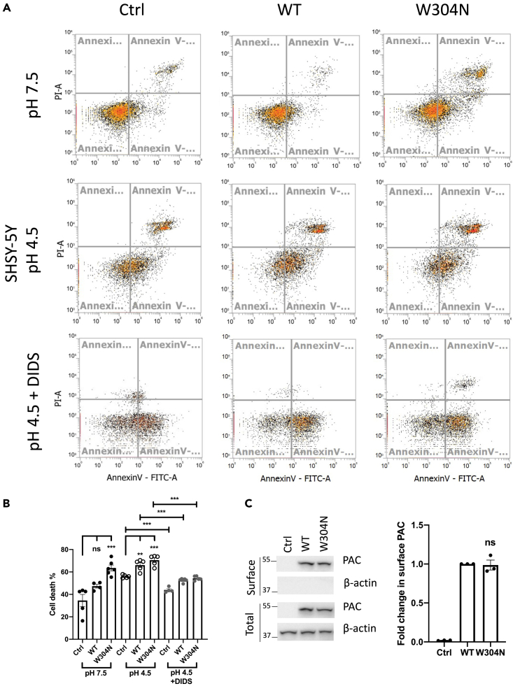 Figure 6. Effect of mutant W304N on the death of SH-SY5Y cells(A) Representative flow cytometry charts showing the FITC-Annexin/PI distribution of SH-SY5Y cells transfected with plasmids encoding empty vector (Ctrl), WT PAC, or mutant W304N at pH 7.5 (upper), 4.5 (middle) or 4.5 + DIDS (100 μM) (lower).(B) Averaged percentages of SH-SY5Y cell death. ns, not significant; ∗∗∗, p < 0.001; ∗∗, p < 0.01, by Student's t-test.(C) Representative Western blot images showing the total or surface expression of PAC-Flag or β-actin in SH-SY5Y cells. Data were averages obtained from three independent experiments.Data are represented as mean ± SEM. Also, see Figure S7.