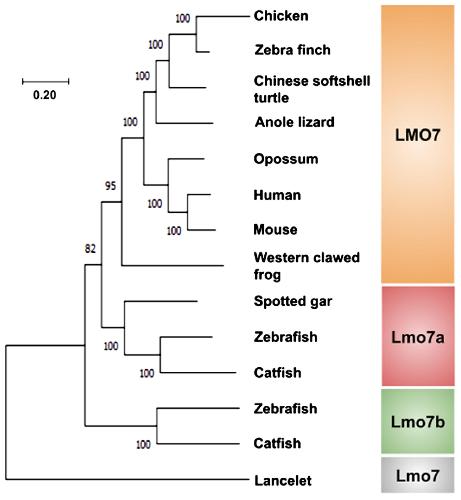Figure 1. Molecular phylogenetic tree of the LMO7 proteins from representative species of vertebrates. The phylogenetic tree was inferred from amino acid sequences using the Branchiostoma floridae Lmo7 protein as an out-group. Bootstrap values were obtained by the neighbor-joining method (1000 replications) using the MEGA 11 software.
