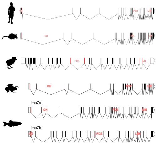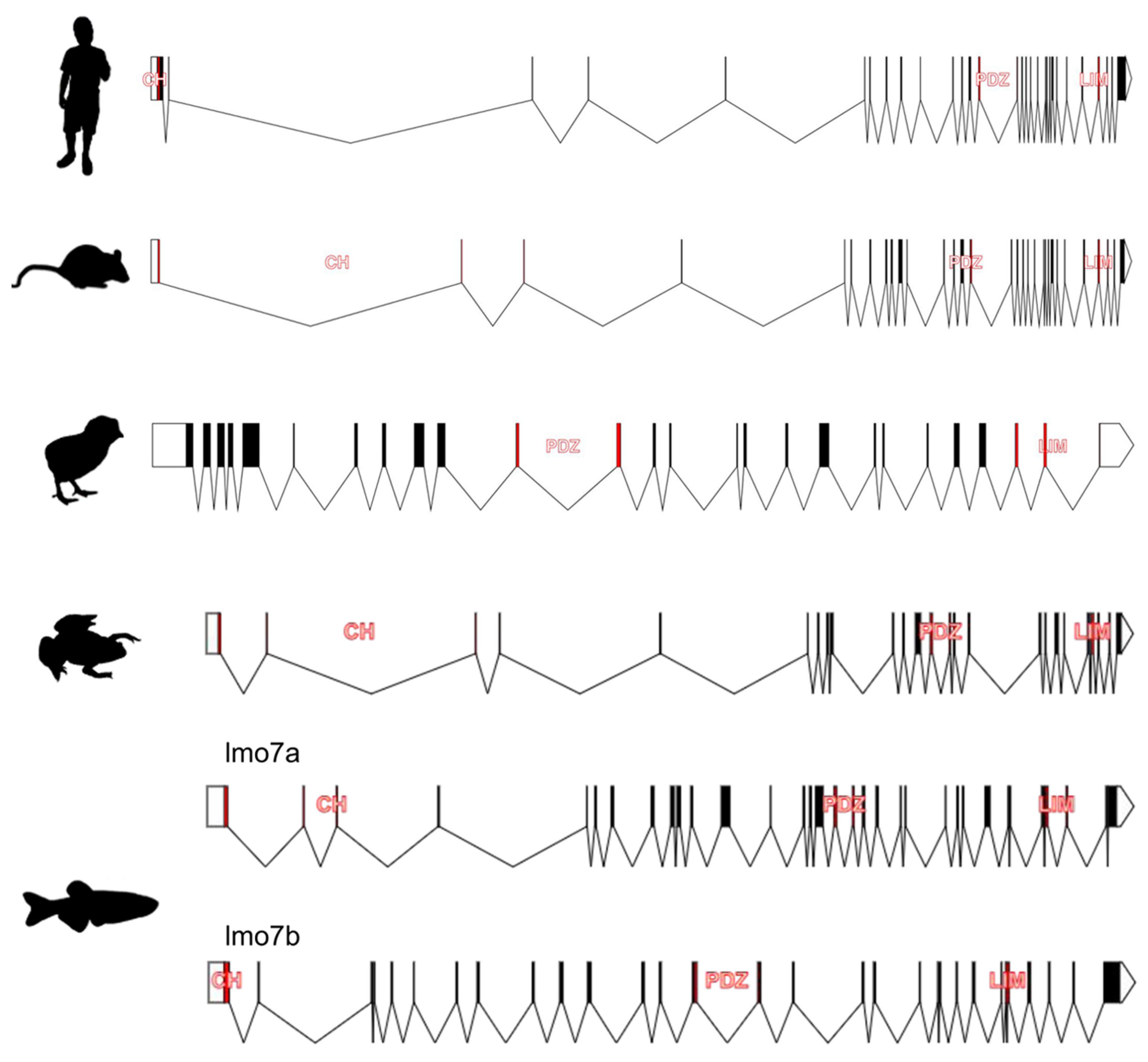 Figure 2. Comparison of the exon–intron organization of the LMO7 transcripts predicted for human and vertebrate model organisms (mouse, chicken, Xenopus and zebrafish). Location of the calponin (CH), PDZ and LIM zinc-binding (LIM) domains is shown for all the species. The CH domain is missing in the chicken LMO7 transcript. The longest transcripts predicted for the two zebrafish lmo7 ortholog genes (lmo7a and lmo7b) are depicted.