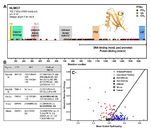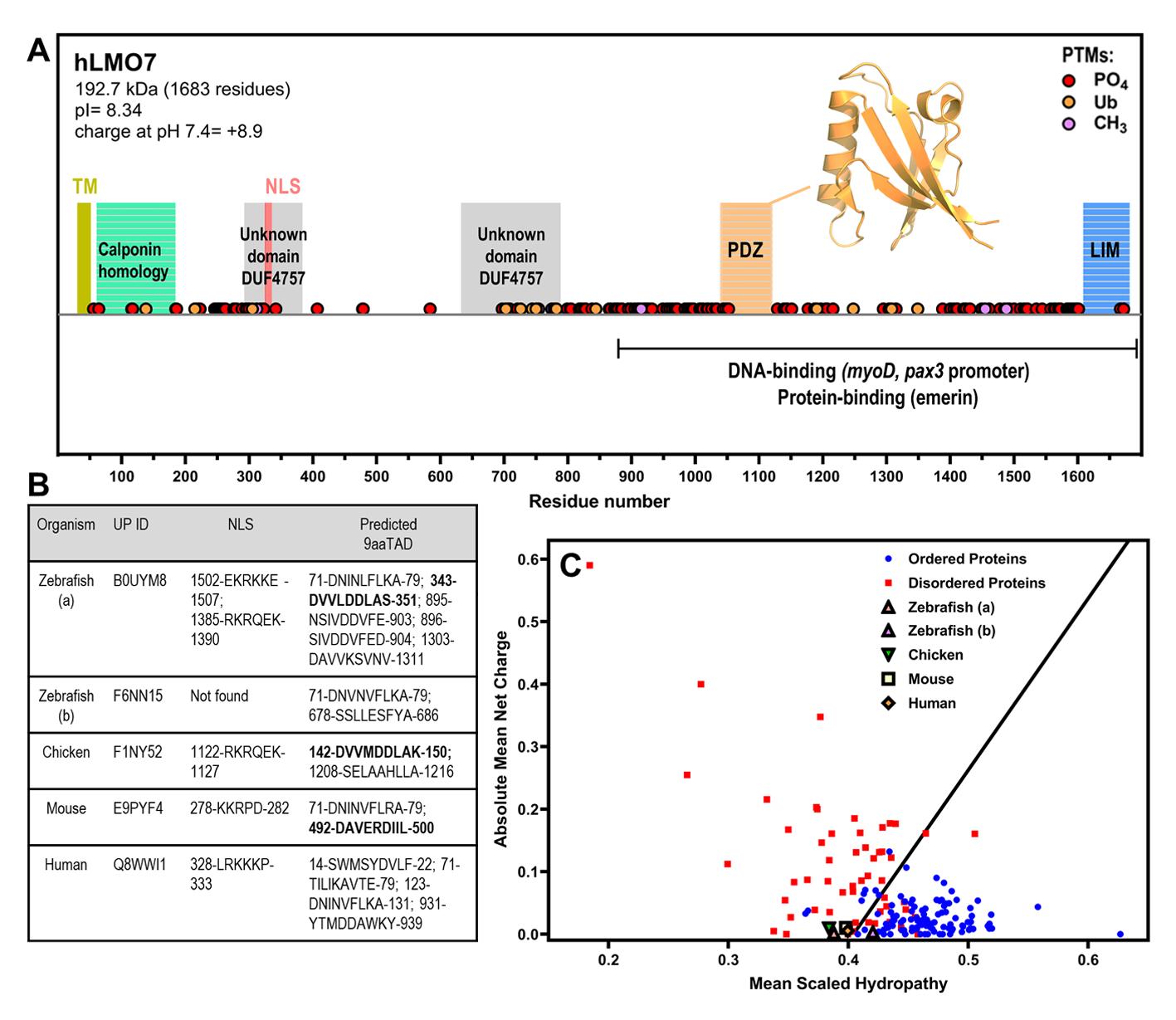 Figure 3. LMO7 is a multidomain protein that has a charge–hydropathy characteristic of proteins enriched in intrinsic disorder and contains nuclear localization sequence(s) and putative nine-amino-acid transactivation motifs. (A) Schematic organization of human LMO7 with the domains, motifs and post-translational modifications (PTMs) indicated along sequence. The C-terminal domain mediates interaction with DNA promoters and protein partners. TM, transmembrane α-helix. NLS, nuclear localization sequence. PO4, phosphorylation. Ub, ubiquitination. CH3, methylation. The inset shows the X-ray crystallographic structure of the PDZ domain (PDB 2eaq). (B) LMO7 from different species were analyzed by NLSdb (third column, https://rostlab.org/services/nlsdb/, 20 November 2021) and 9aaTAD (fourth column, https://www.med.muni.cz/9aaTAD/). Perfect matches of 9aaTAD are highlighted in bold whereas other annotated motifs correspond to 92% matches. Corresponding UniProt identifiers (UP ID) are shown in the second column. (C) Predictor of Natural Disordered Regions (PONDR; http://www.pondr.com/) analysis of charge–hydropathy (CH plot). Well-folded proteins indicated as blue circles and disordered proteins as red squares. LMO7 from the different species is located in the plot region of disordered proteins apart from isoform b of zebrafish.