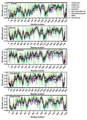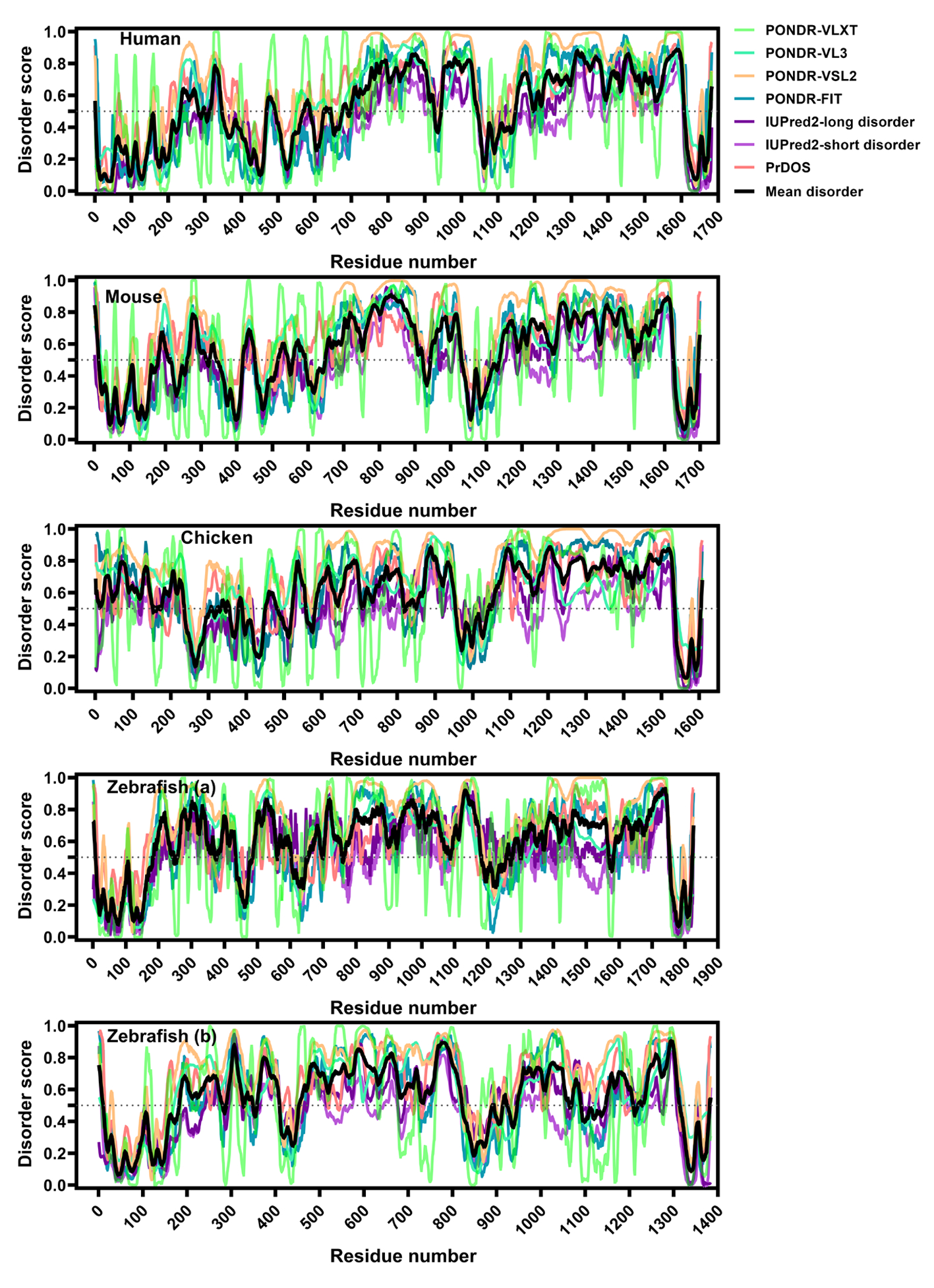 Figure 4. LMO7 is enriched in intrinsic disorder and this feature is conserved across evolution. Analysis of intrinsic disorder by seven disorder predictors along the LMO7 primary structure. Note that the C-terminal protein/DNA-binding region is the longest disordered segment. Data from PONDR-VLXT (light green curve), PONDR-VL3 (green curve) and PONDR-VSL2 (pale orange curve) were provided by http://www.pondr.com/; from PONDR-FIT (blue curve)—by http://original.disprot.org/pondr-fit.php; from IUPred2-long disorder (dark purple curve) and IUPred2-short disorder (purple curve)—by https://iupred2a.elte.hu/plotand; from PrDOS (pink curve)—by http://prdos.hgc.jp/cgi-bin/top.cgi. The average of disorder across all the algorithms was calculated (black curve). Scores higher than 0.5 represent disordered regions, and values between 0.2 and 0.5 indicate flexible segments.