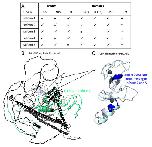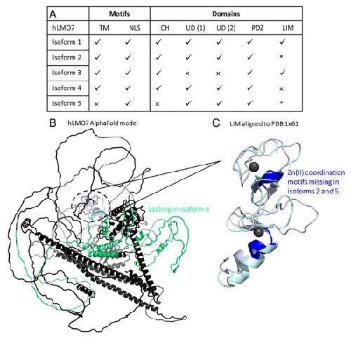 Figure 7. Comparison of domains organization of the five isoforms from human LMO7. (A) Summary of results from the primary structure alignment among the hLMO7 isoforms. √, presence. ×, absence. * lacks Zn(II) binding motifs. TM, transmembrane α-helix. NLS, nuclear localization sequence. CH, calponin homology domain. UD, unknown domain DUF4757. (B) hLMO7 Alpha Fold-predicted structural model showing the region missing in isoform 3 (green) and the LIM domain (white) which is only conserved in isoforms 1 and 3. (C) Superimposition of the LIM domain of hLMO7 (obtained by AlphaFold; white ribbon representation) and the LIM domain of TRIP6 (PDB 1X61; pale green ribbon representation), which is the closest structural analog reported by I-TASSER [42]. Two zinc ions (black spheres) are coordinated in the fingers. Regions highlighted in dark blue are missing in isoforms 2 and 5. Furthermore, isoform 4 does not have the full LIM domain.