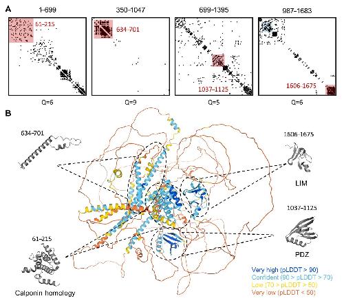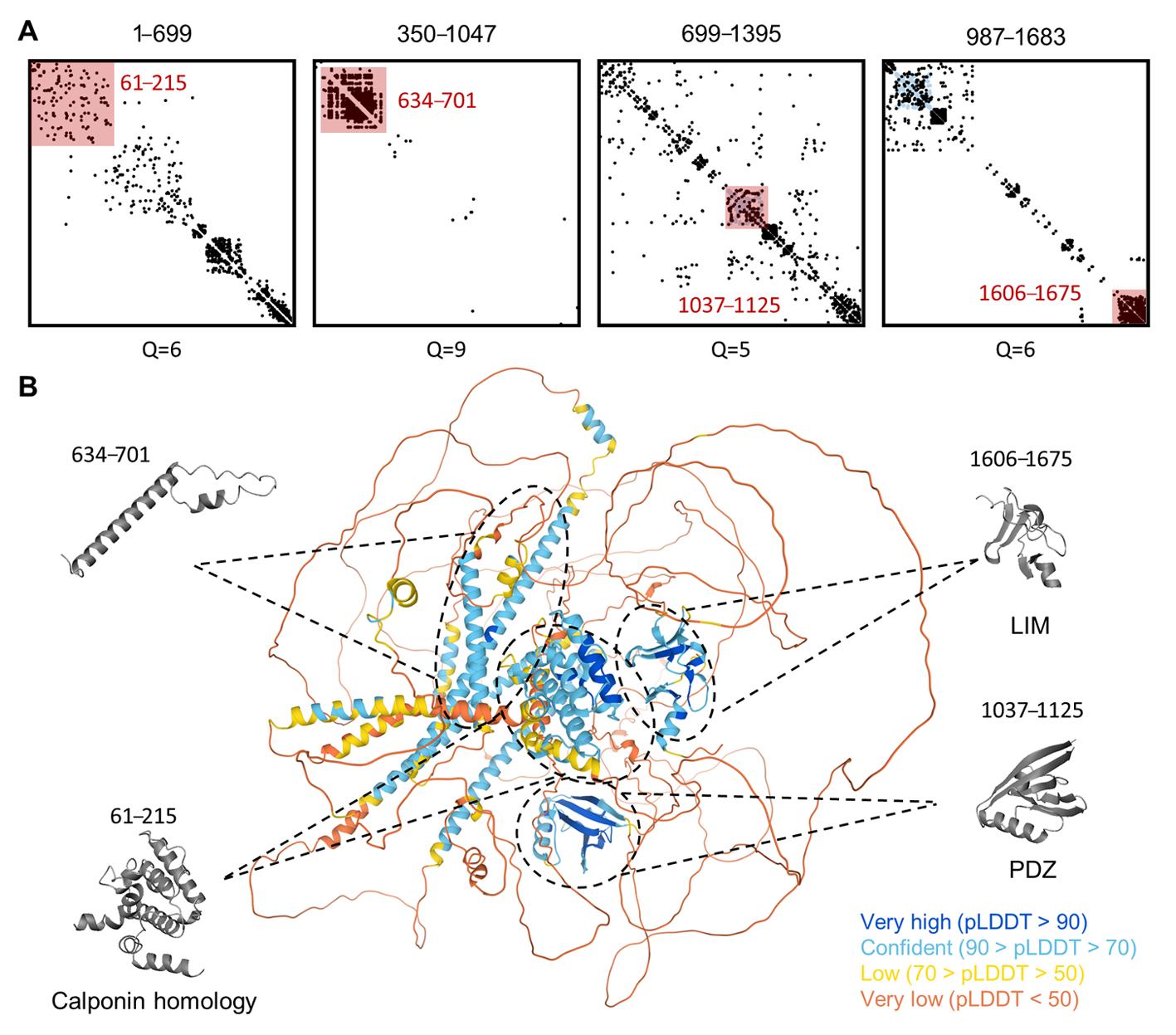 Figure 8. Three-dimensional structure model prediction of hLMO7 indicates the presence of well-folded domains and many intrinsic disorder regions with long-range evolutionary couplings. The evolutionary couplings of overlapping regions of LMO7 were calculated by the EVcoupling server (A). The quality scores (Q) for the identification of evolutionary couplings are indicated for each segment and range from 0 (worst) to 10 (best). The pink-shaded squares highlight well-folded domains previously described (residues 61–215, 1037–1125 and 1606–1675) as well as the one identified here (residues 634–701). The 3D structure calculated by the AlphaFold server is indicated in (B). Each globular domain highlighted by EVcoupling is indicated in the 3D model. The full-length protein 3D model is colored by the fold prediction confidence score for each amino acid residue (bottom right legend).